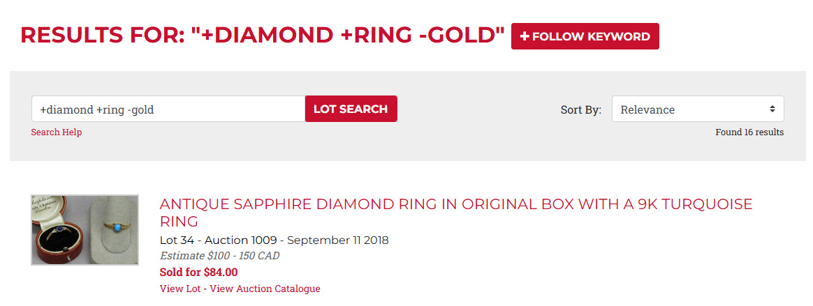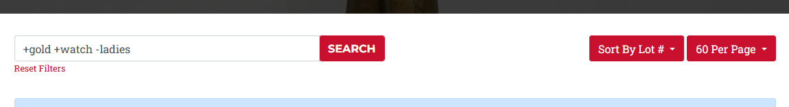 By default, when you enter your keywords, our tool will find lots best matching either or all of your keywords, which means if you were to search for “gold watch” it will find lots that match both “gold” and “watch,” and then lots that match either “gold” or “watch.”