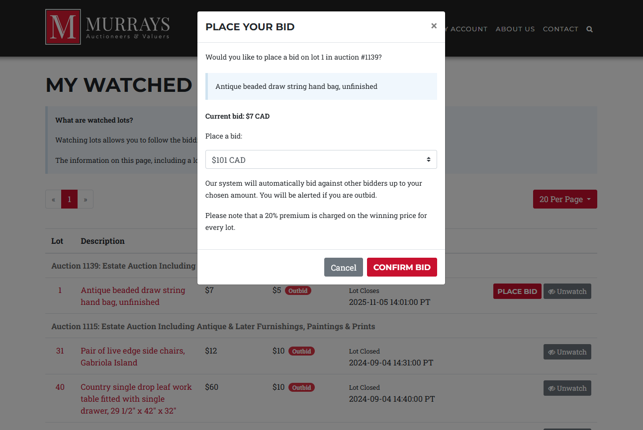 We have enhanced our Watched Lots tool to not only automatically update with the latest information, but you can now bid directly from the Watched Lots tool without leaving the page!