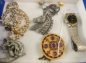 lot of vintage signed jewelery, liberty enamel brooch, waltham quartz watch
