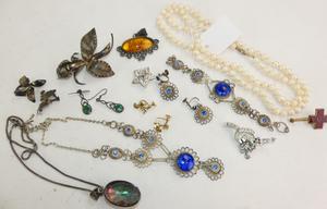 cultured pearl necklace, nacre damaged, filigree suite, silver orchich suite, misc costume