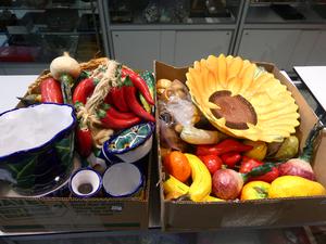 lot of mexican pottery and vegetable sculptures
