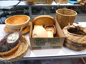 lot of woven baskets and wooden platters