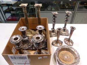 lot of silver plate candle sticks and a bottle coaster