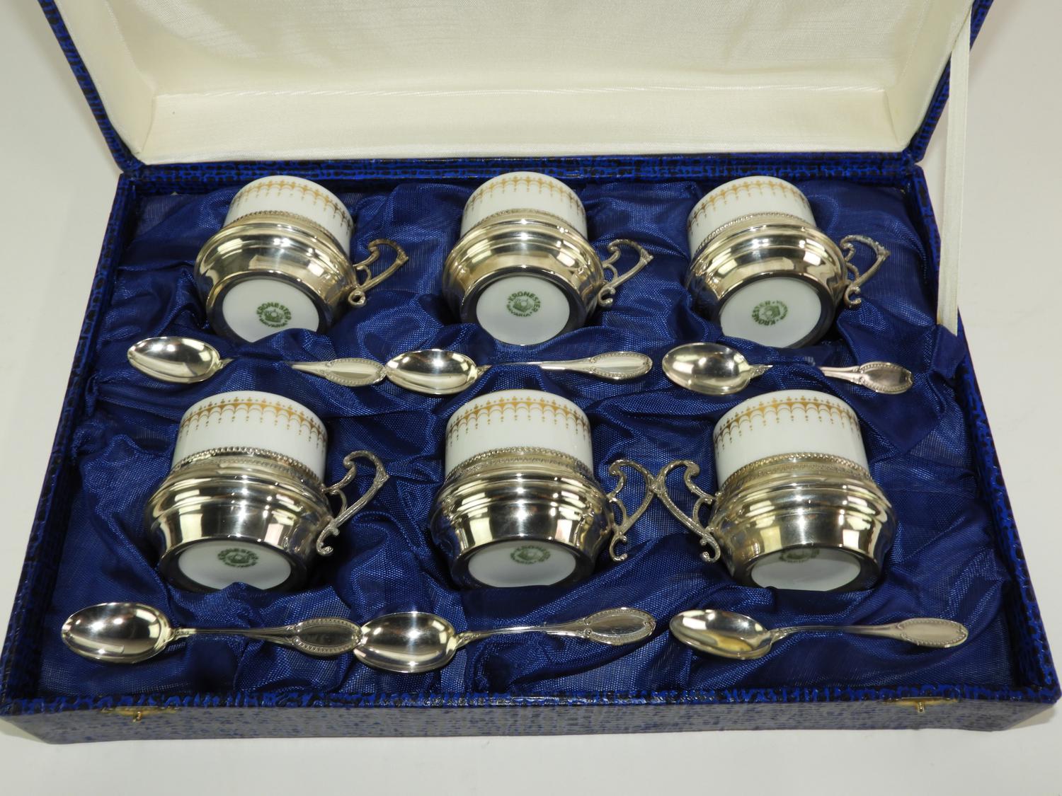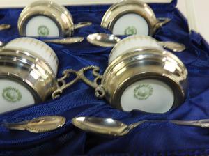 cased bavarian .800 silver and gilt decorated porcelain coffee cups and spoons