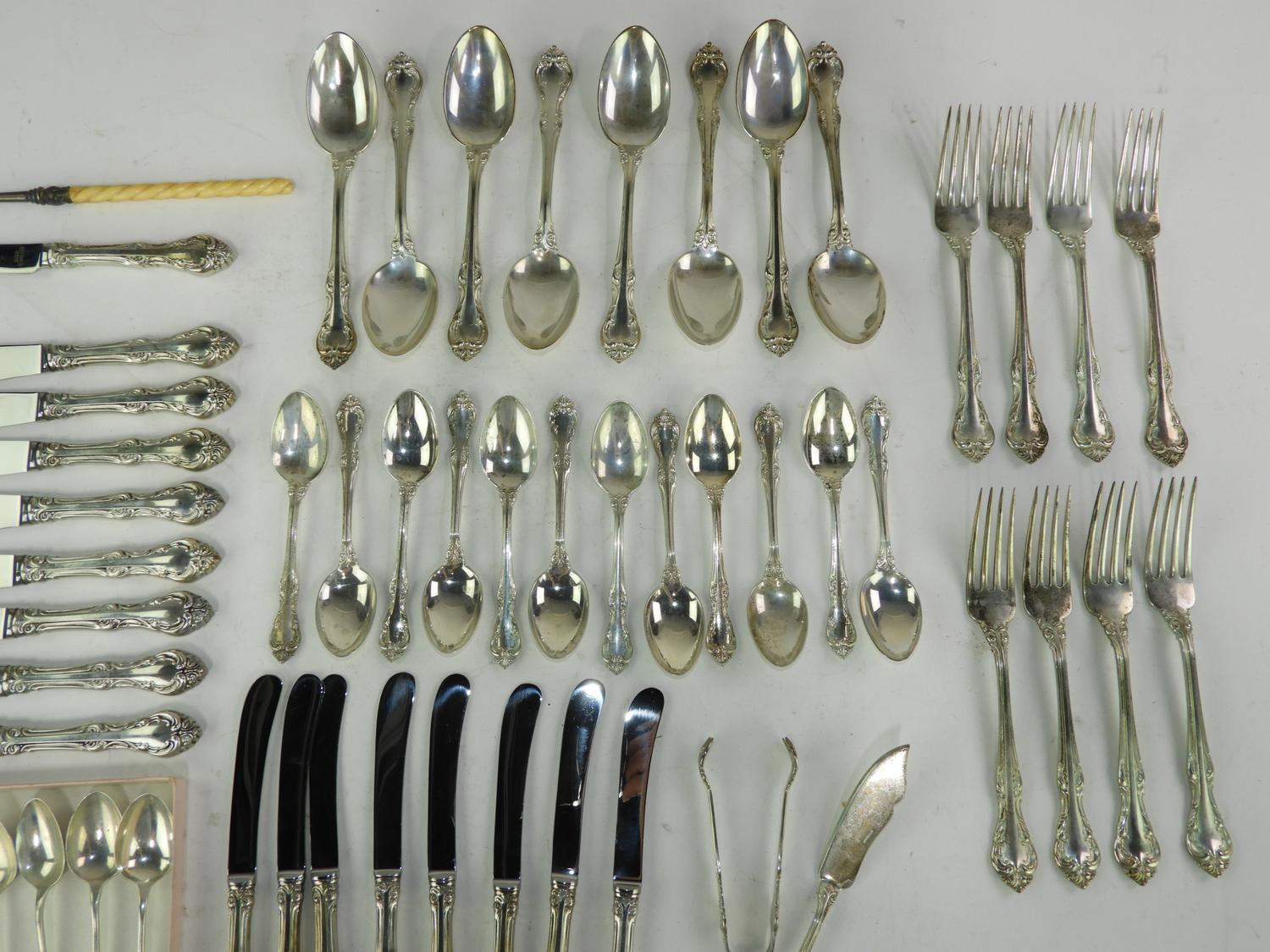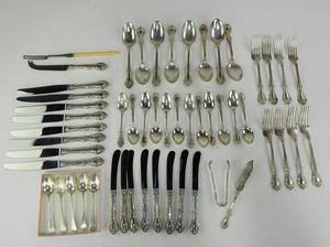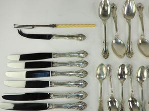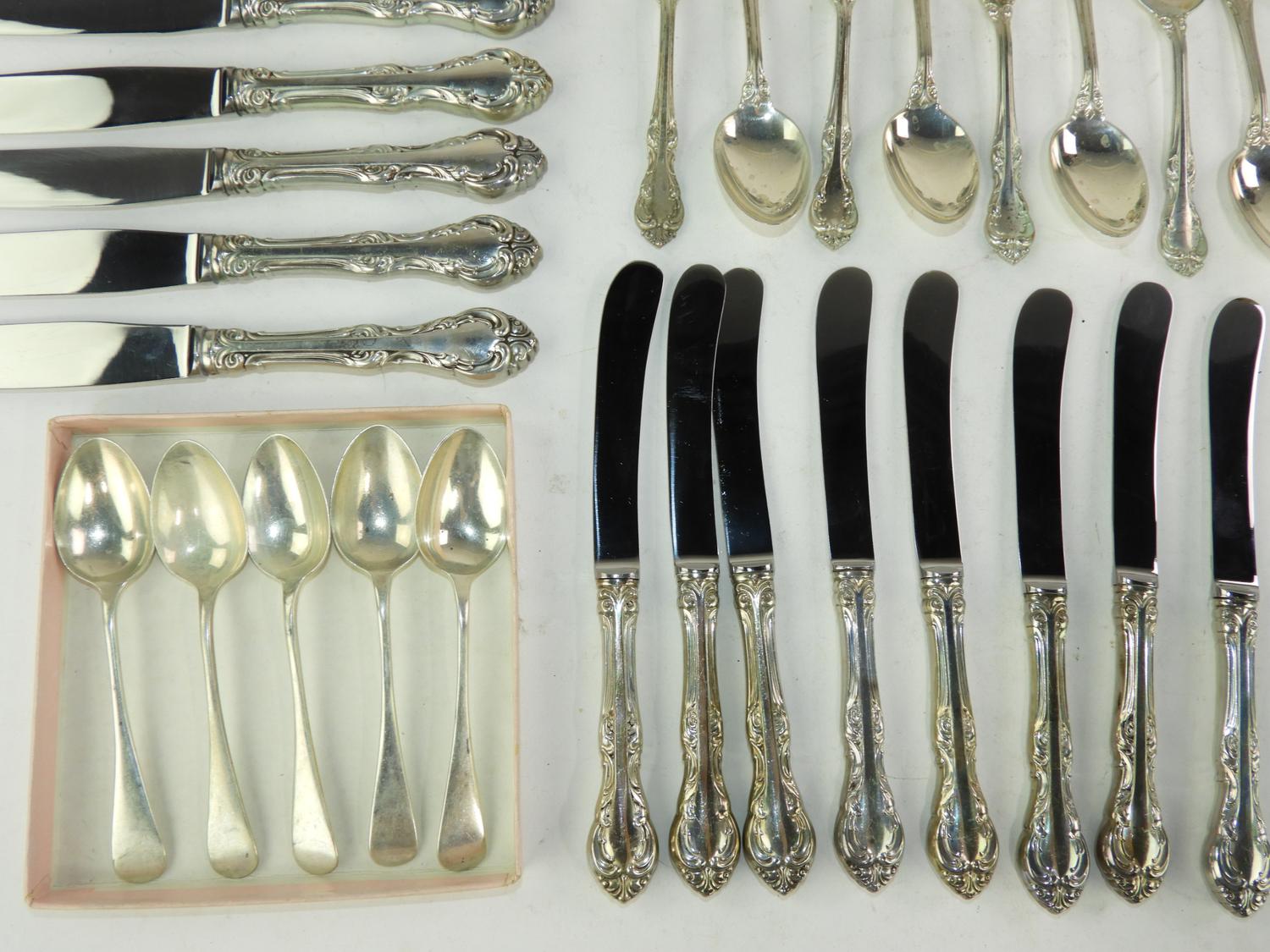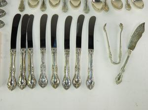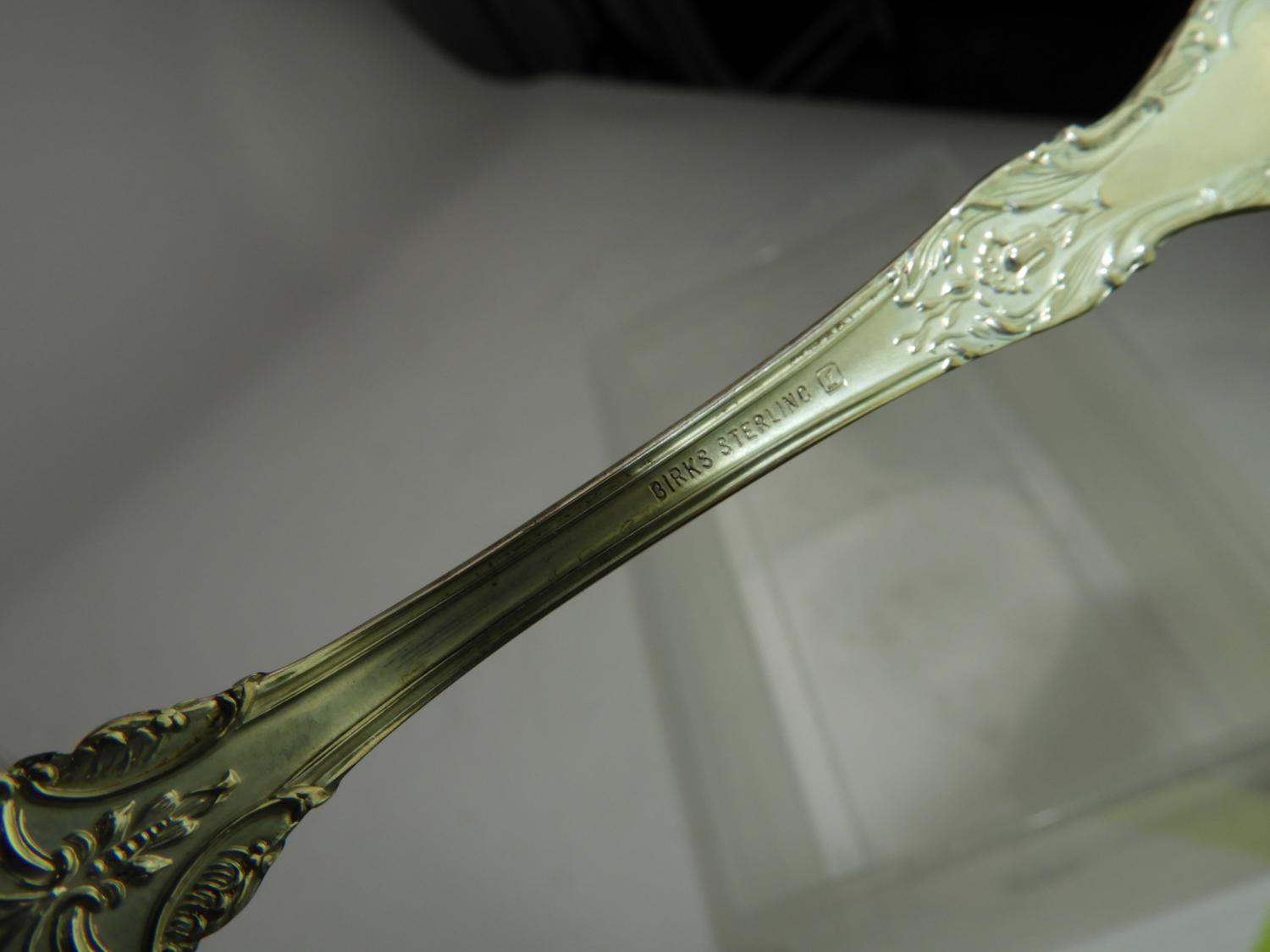 lot of birks sterling silver flatware with five sterling silver spoons, weighable silver 1117 grams plus 8 knives, 8 butter knives and a cheese knife