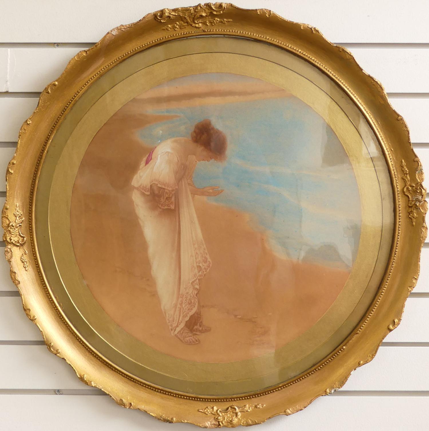 art nouveau gilt framed lithograph, overall 25", "young lady collecting shells"
