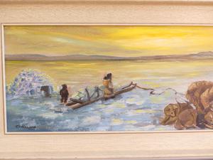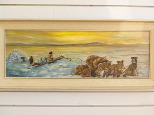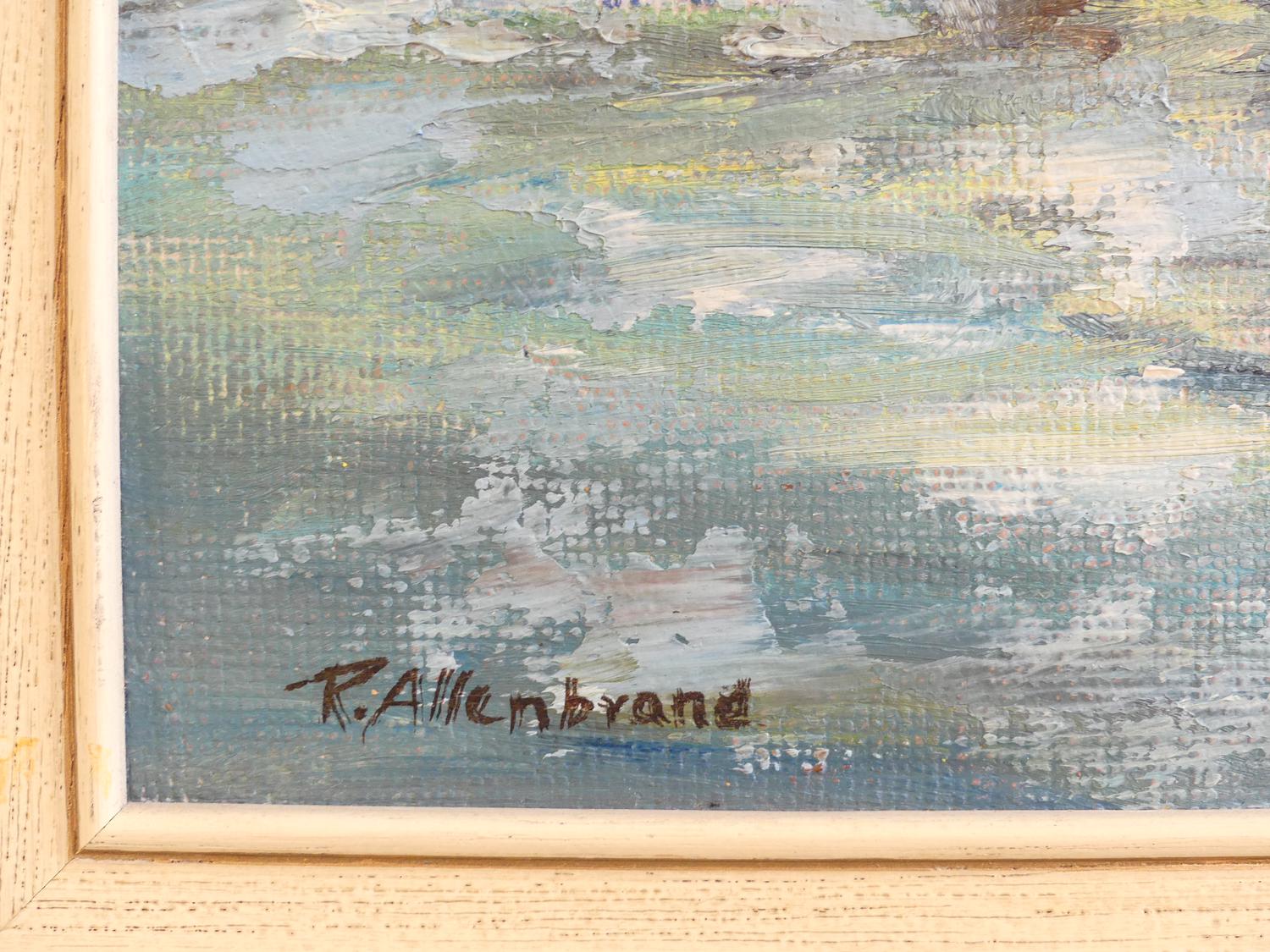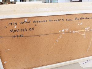 rose allenbrand, dated 1974, oil on board, 10" x 30", "moving on"