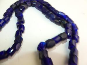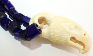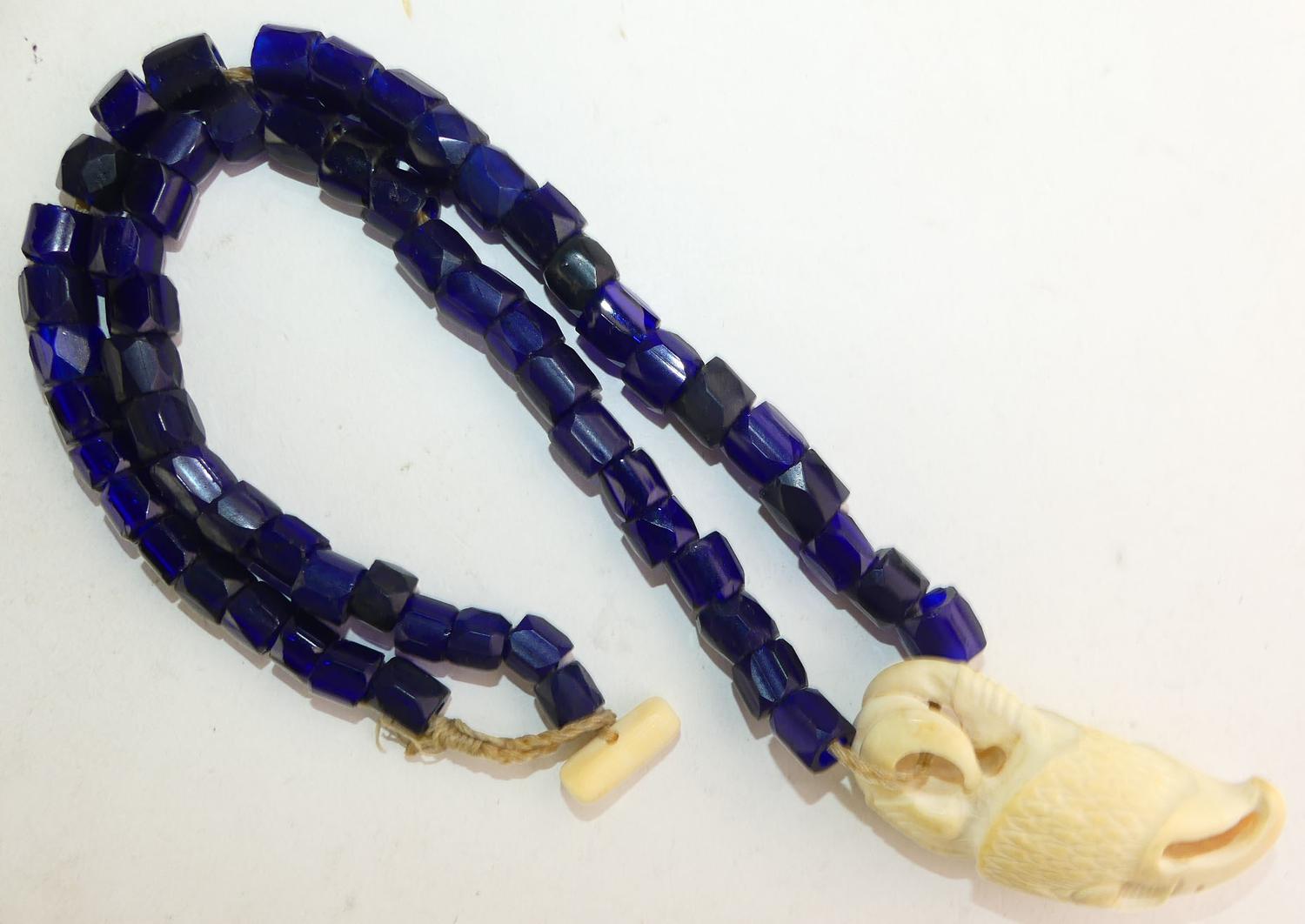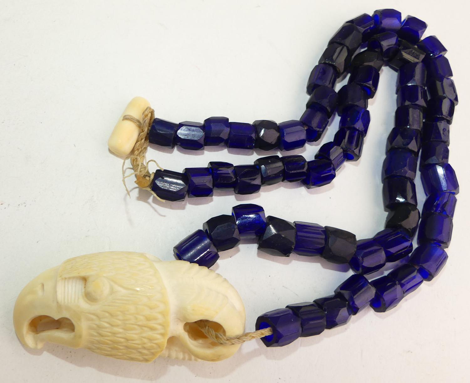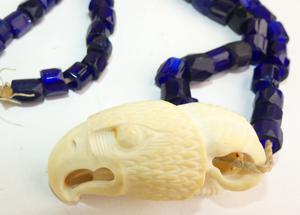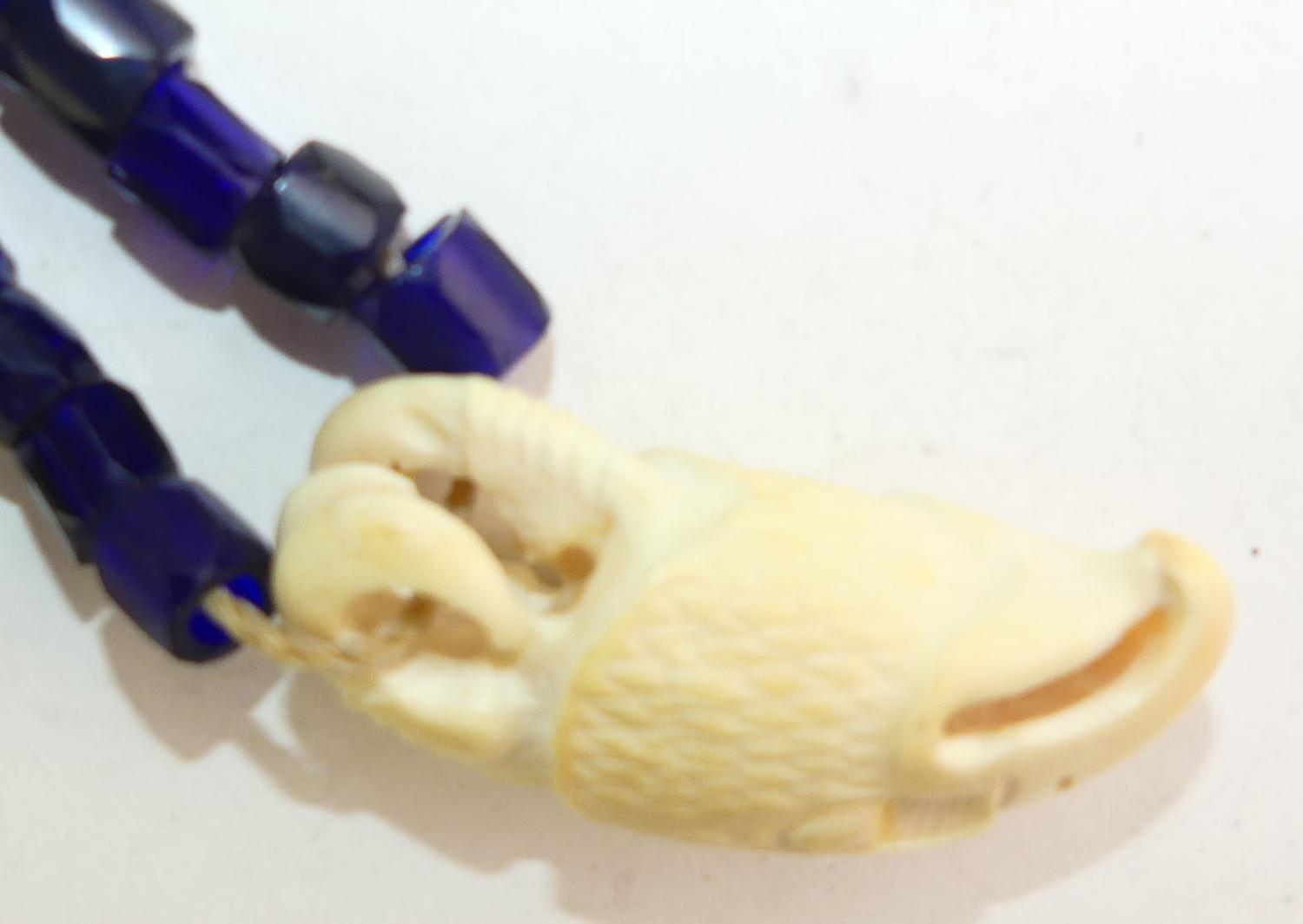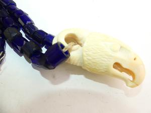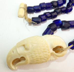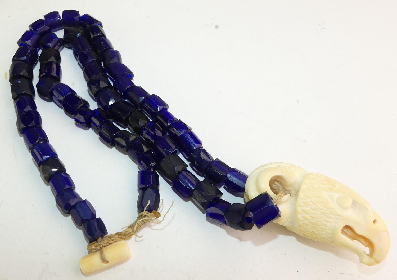 carved ivory eagle pendant necklace, with facetted blue trade glass beads, length 22"