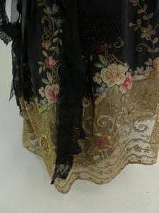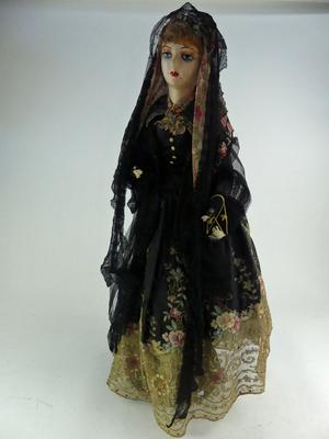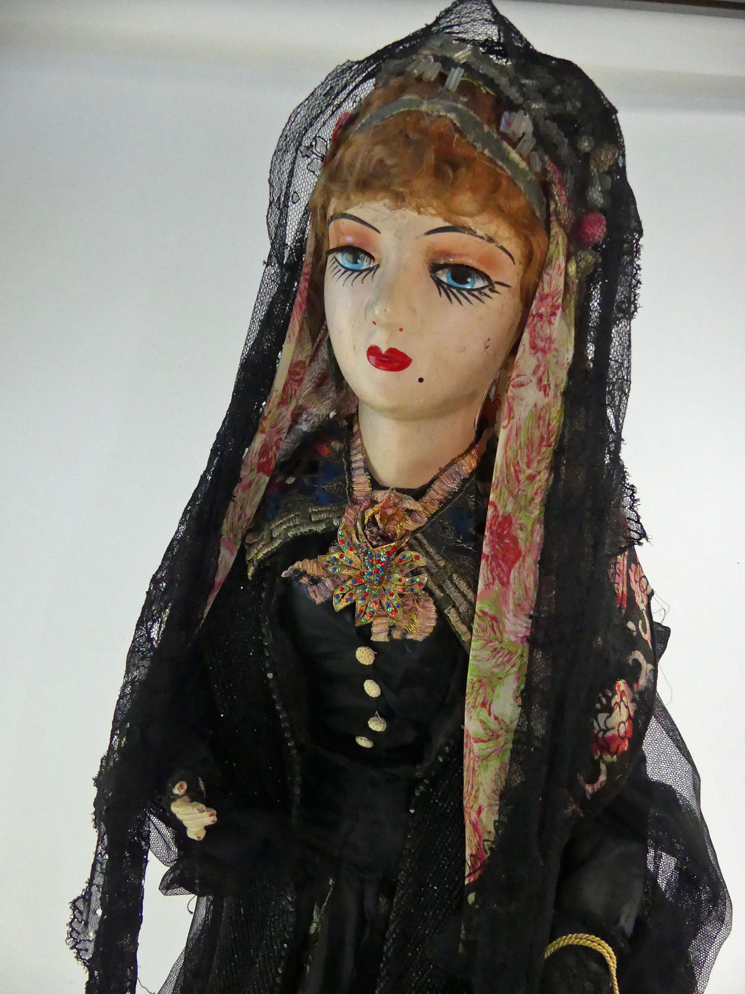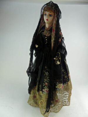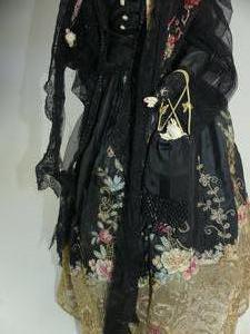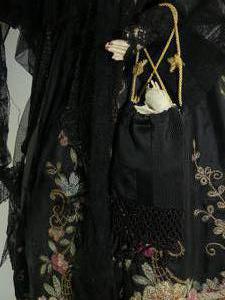 early 20th century doll on stand with embroidered and jet bead clothing