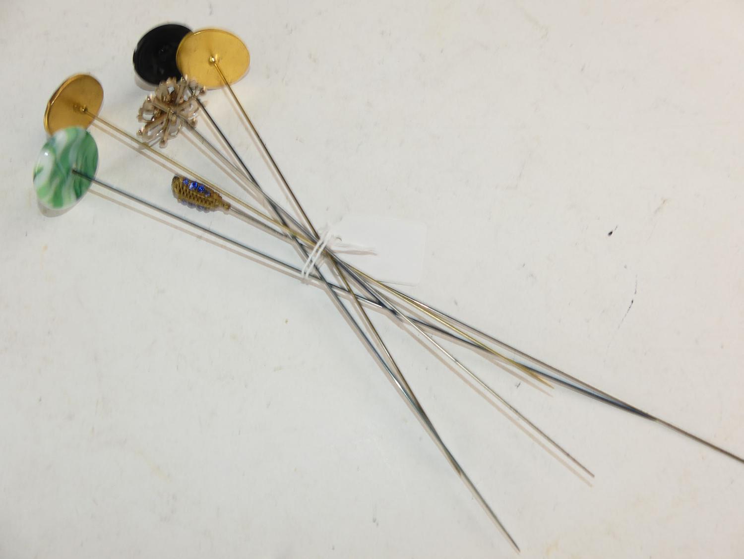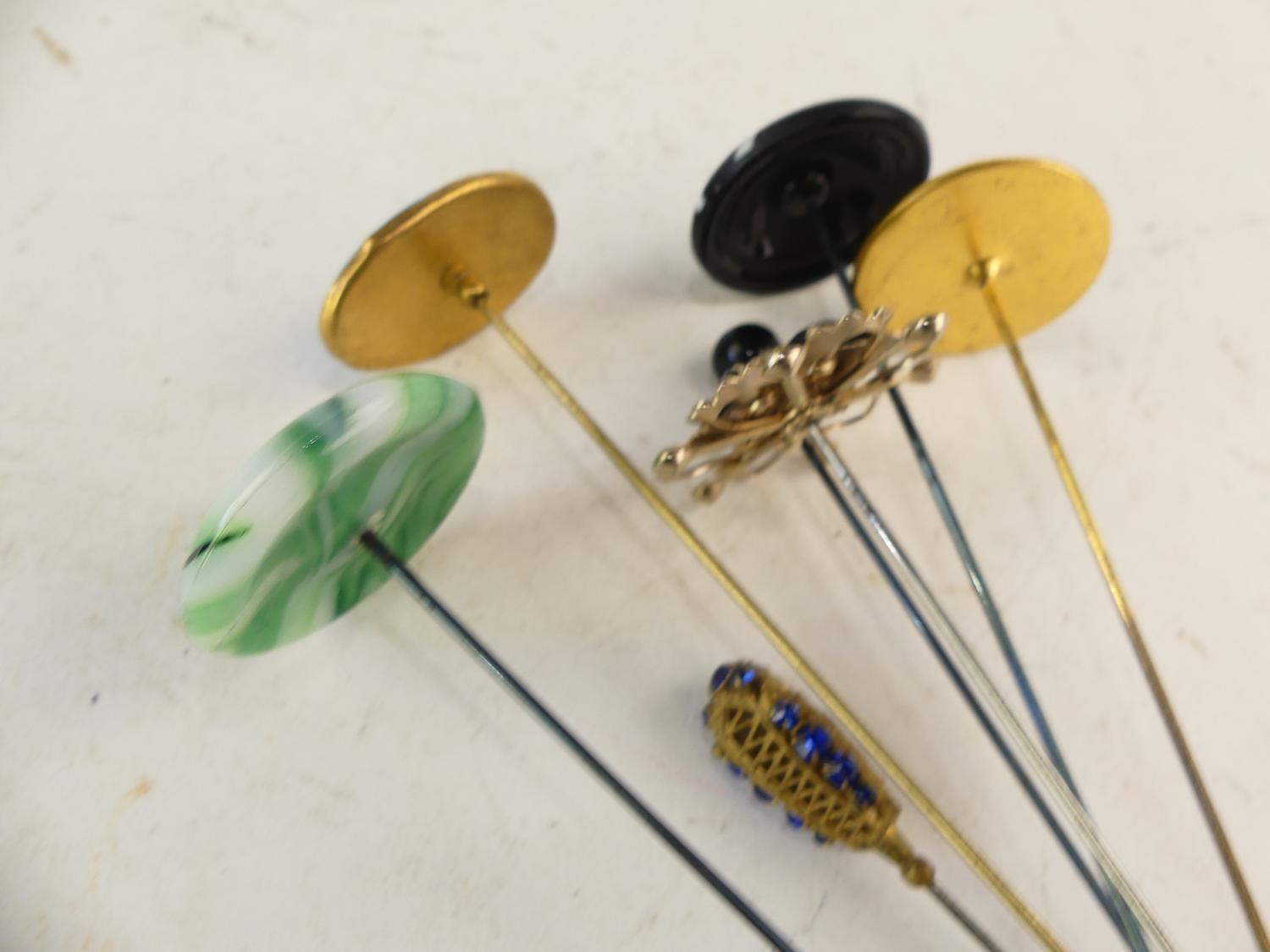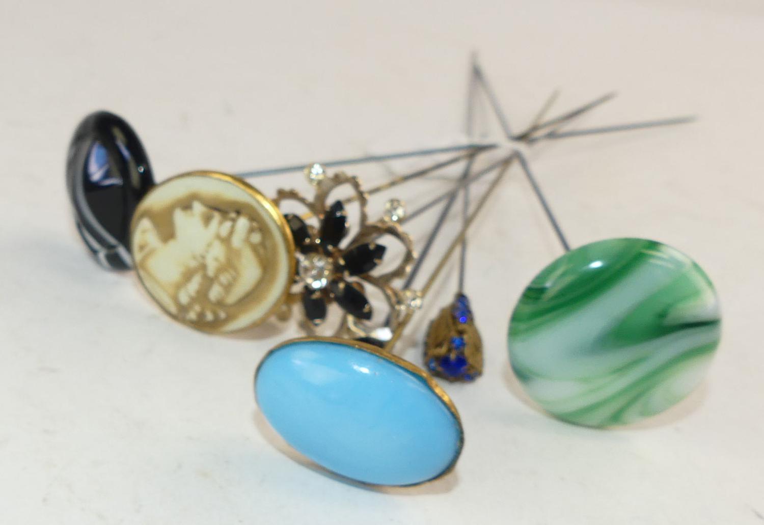 7 vintage hatpins including cameo on glass, 11" and smaller