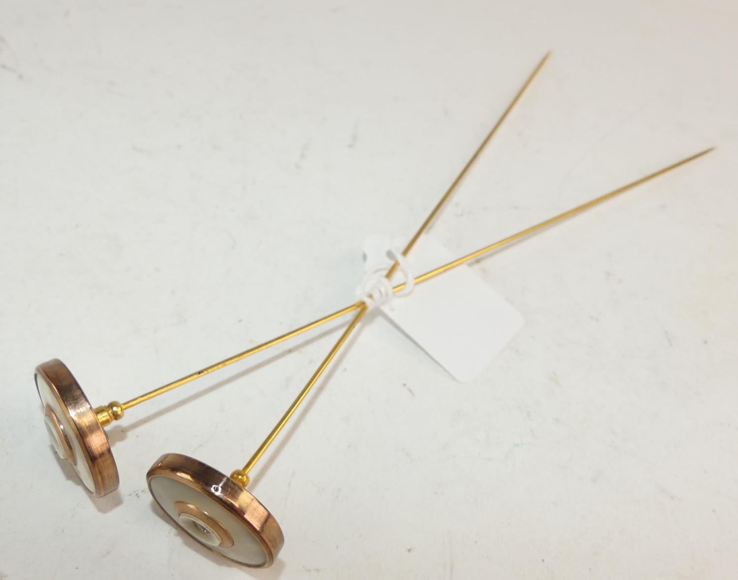 pair of edwardian gold filled mother of pearl swivel hatpins, 9"
