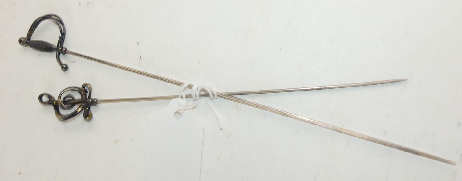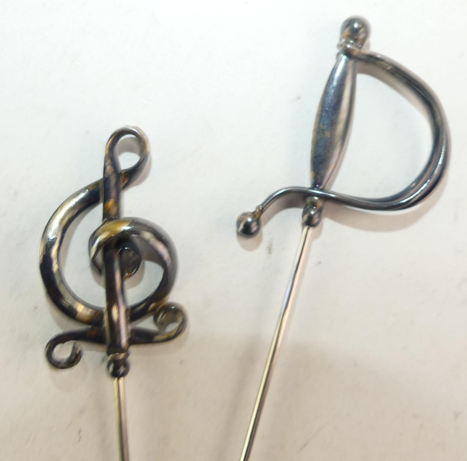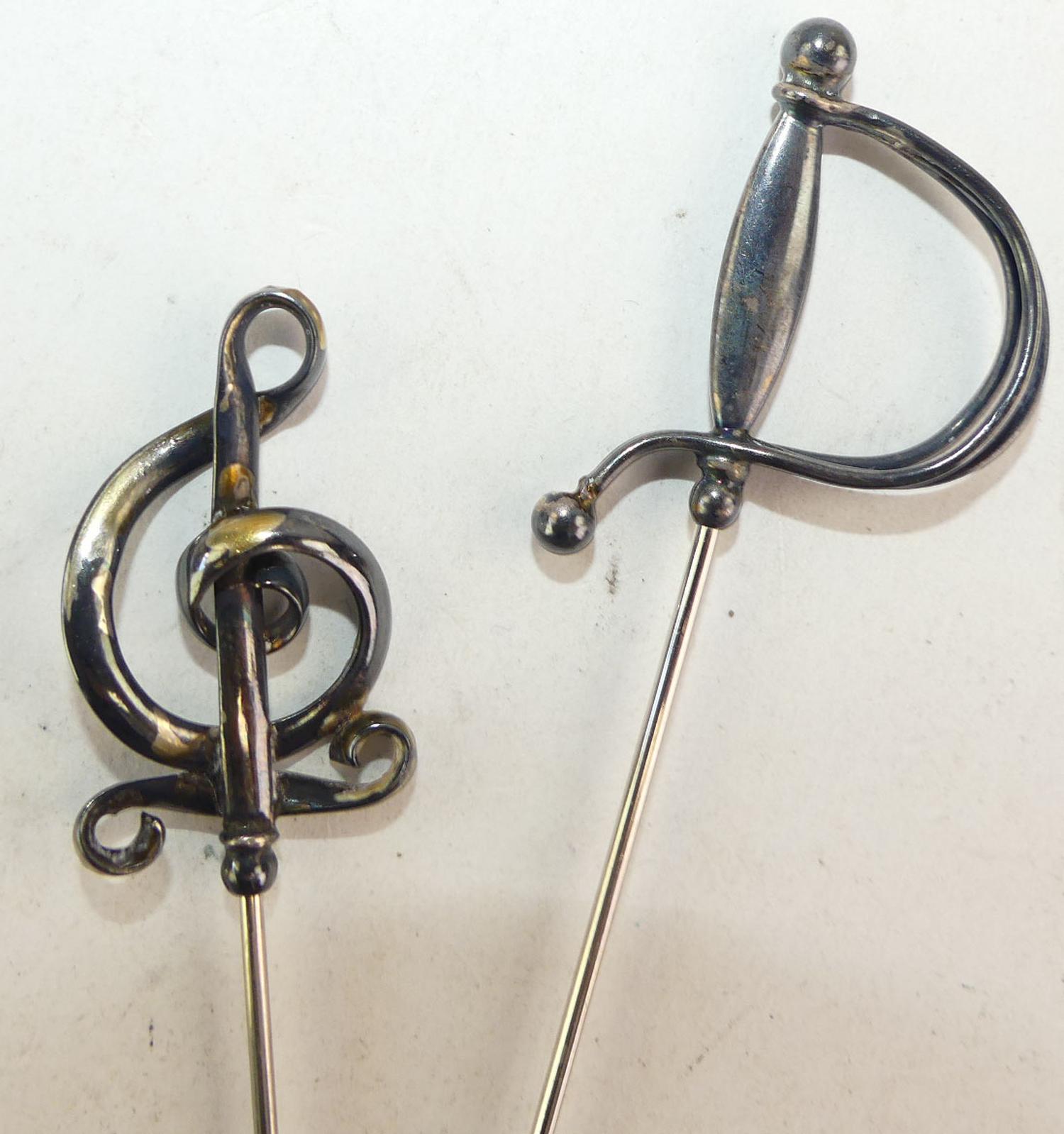2 sterling silver hallmarked sword motif hatpins, charles horner, 9" and smaller