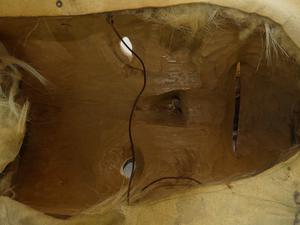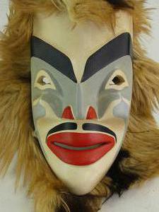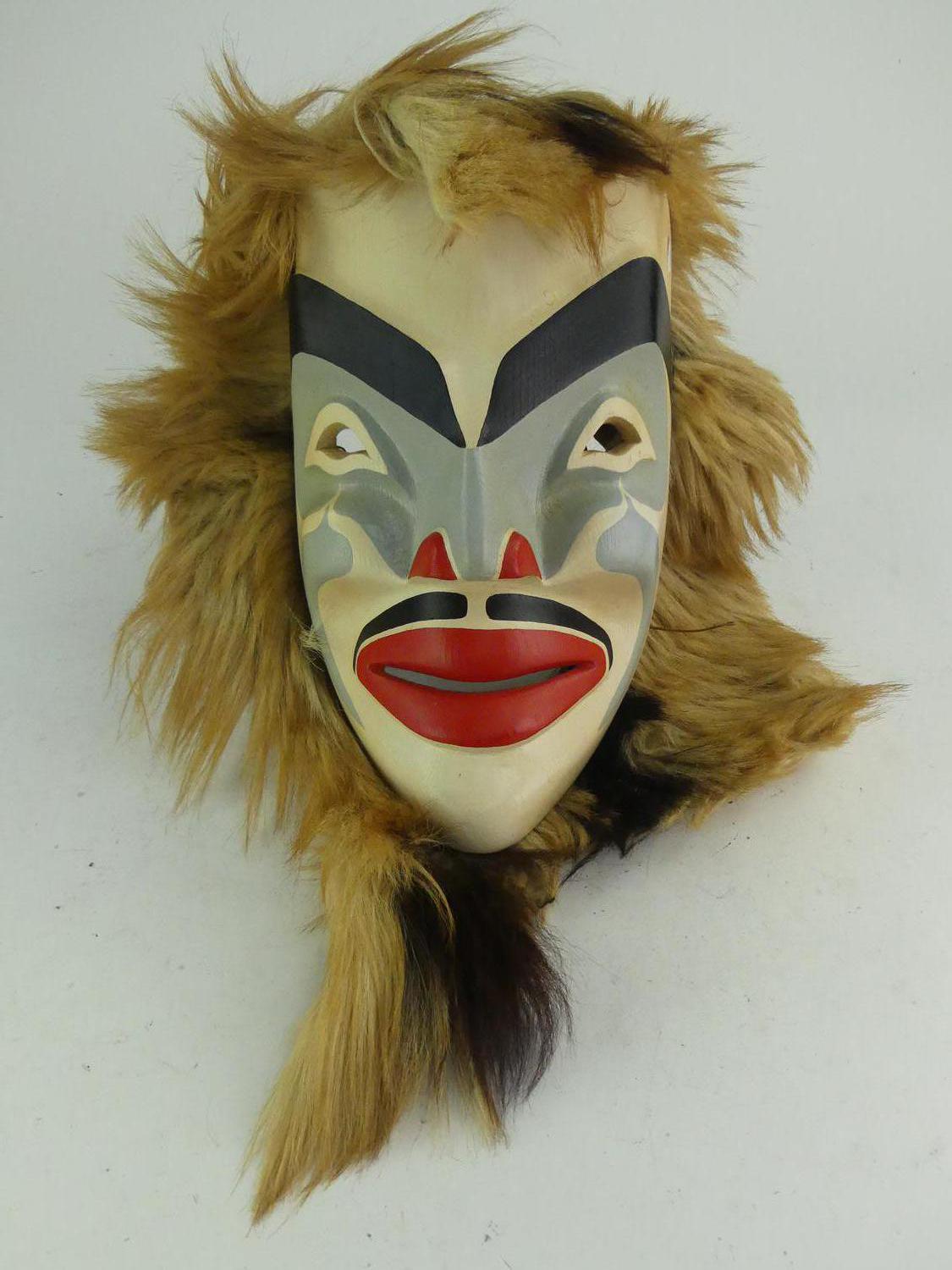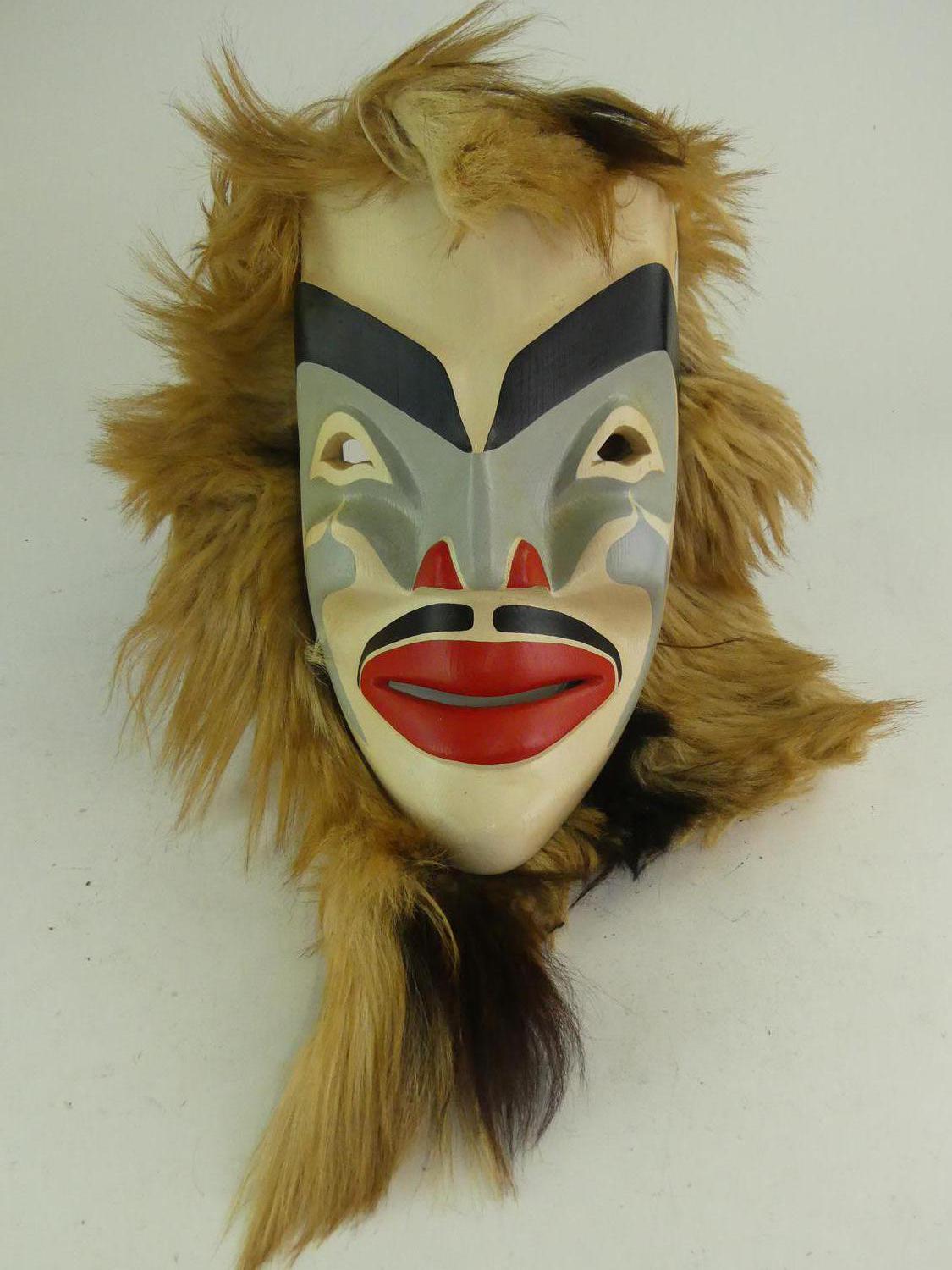 west coast native carved and painted mask mounted with fur