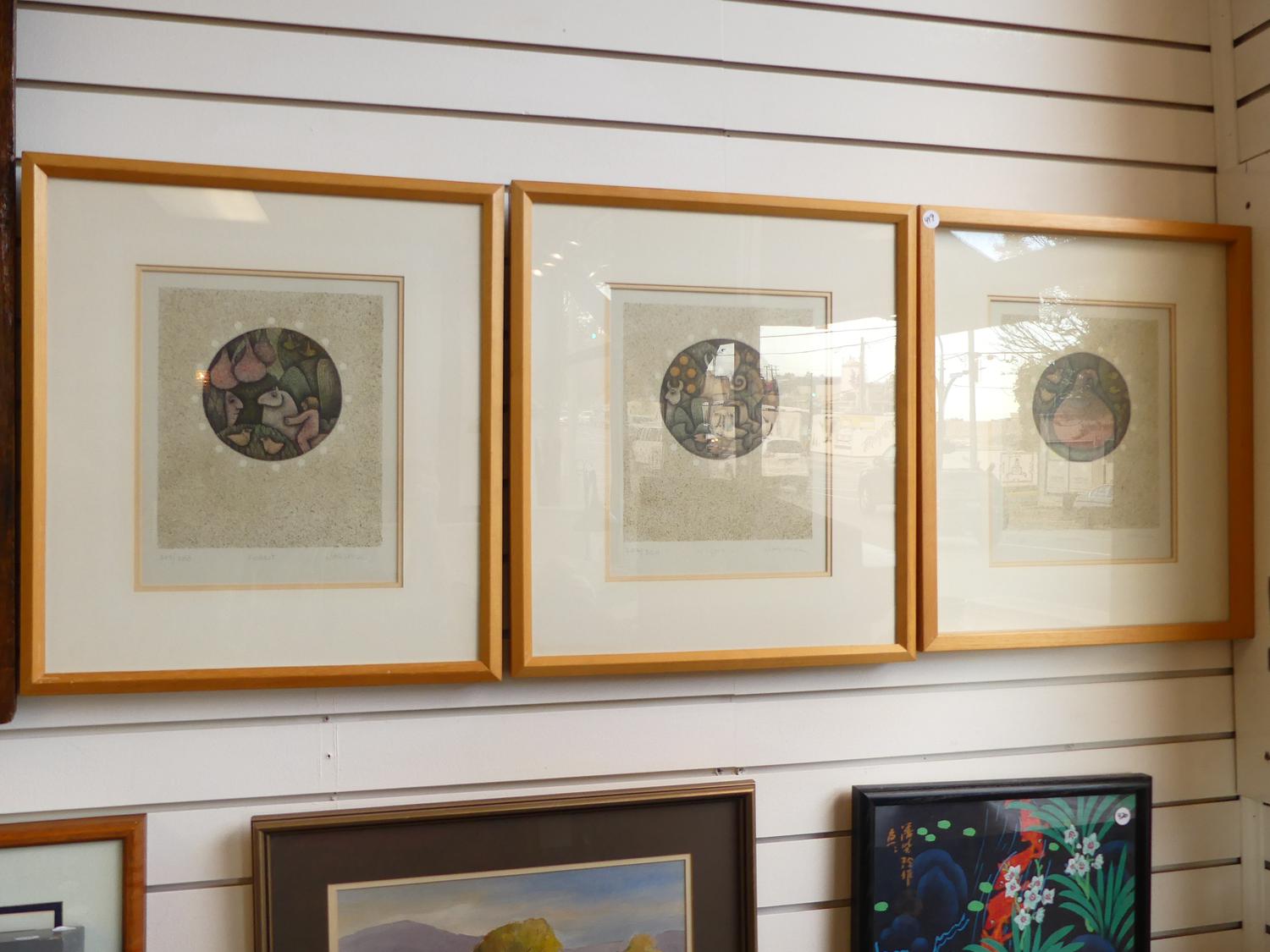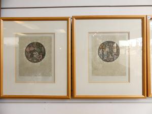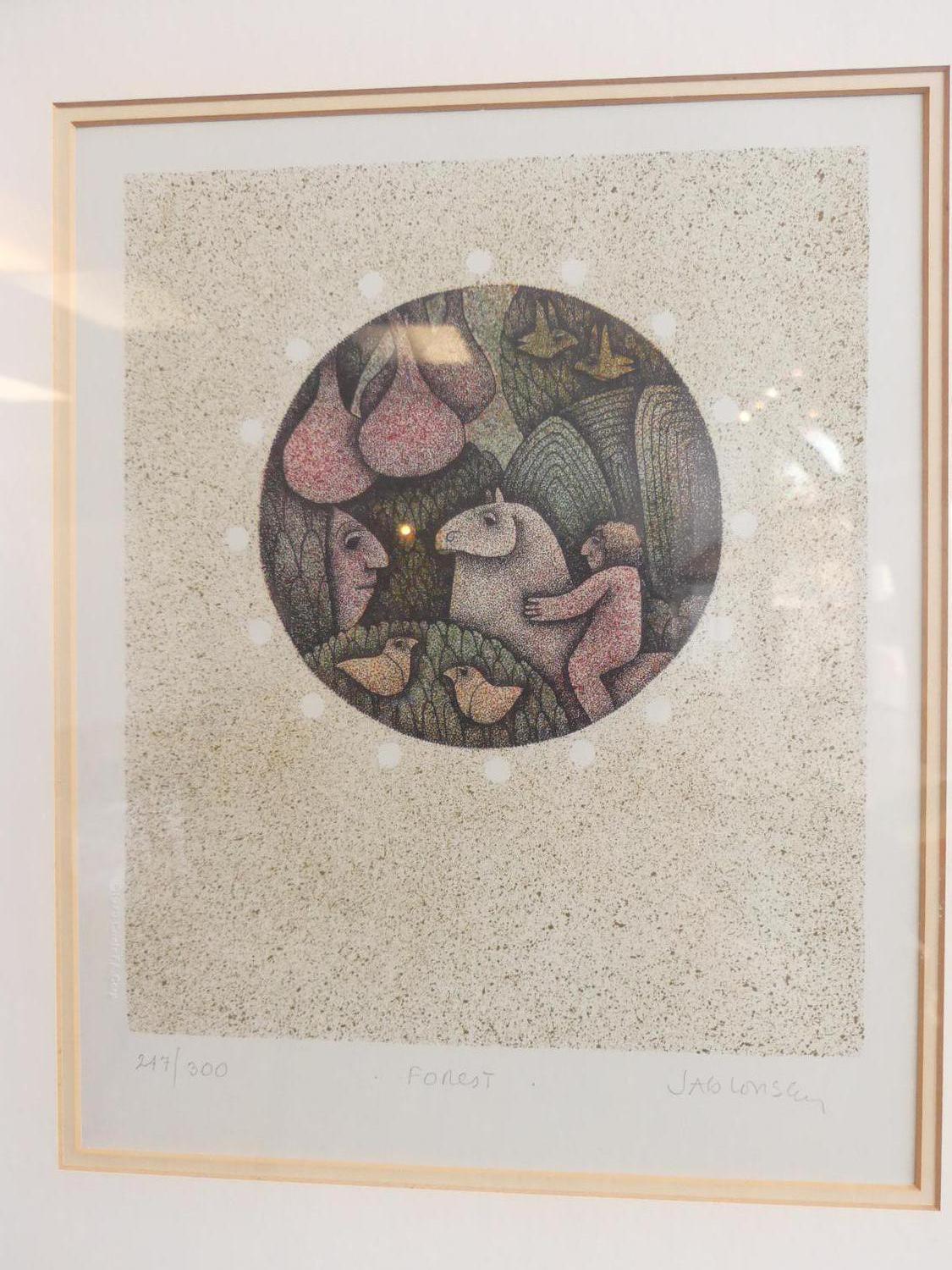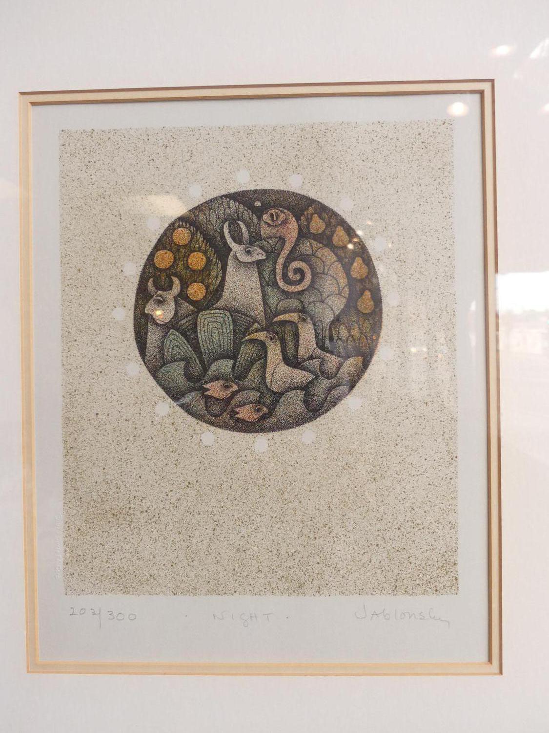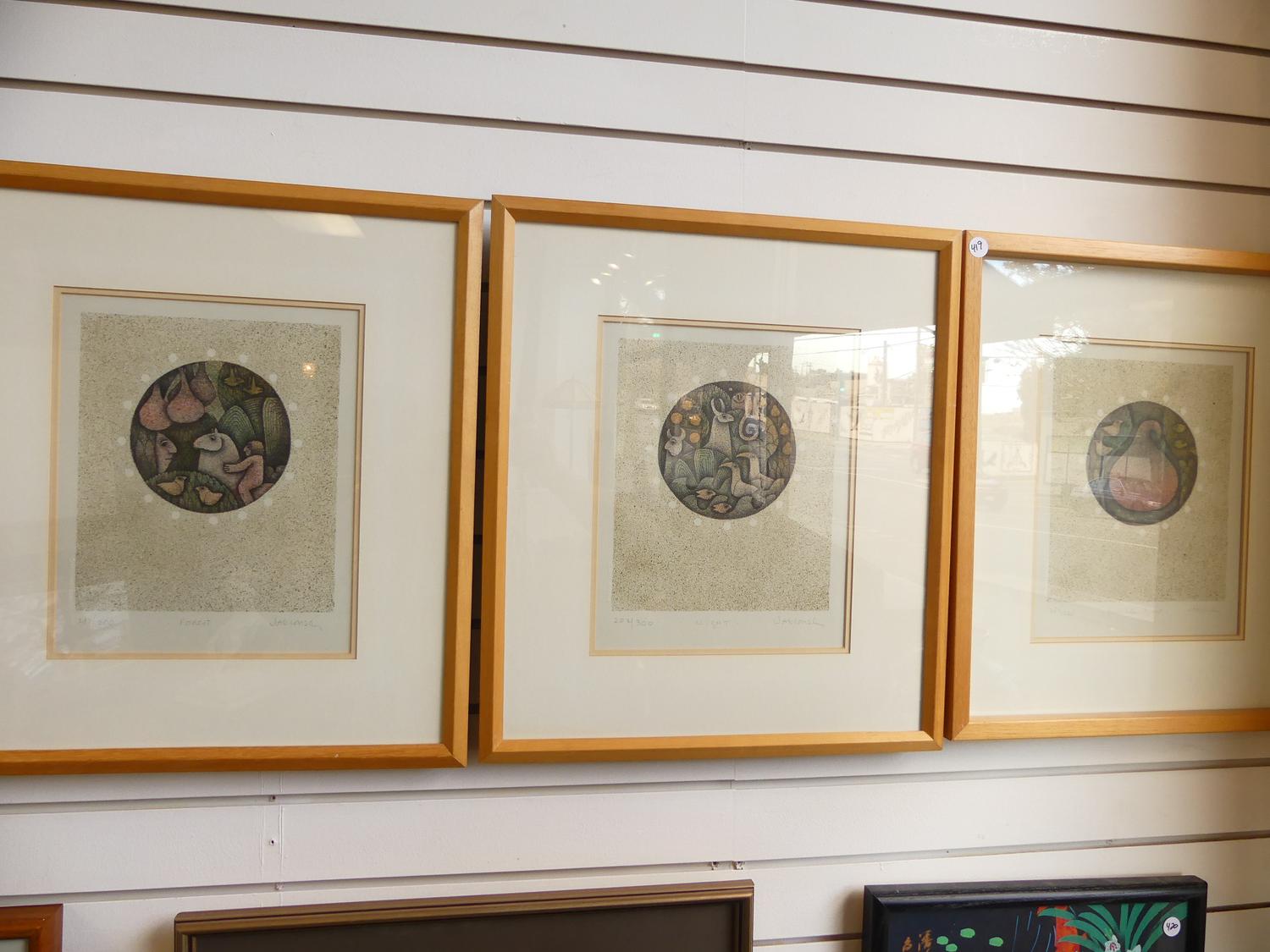 carol jablonsky (1939-1992), three prints, overall 19" x 17", "forest", "forbidden fruit" & "night"