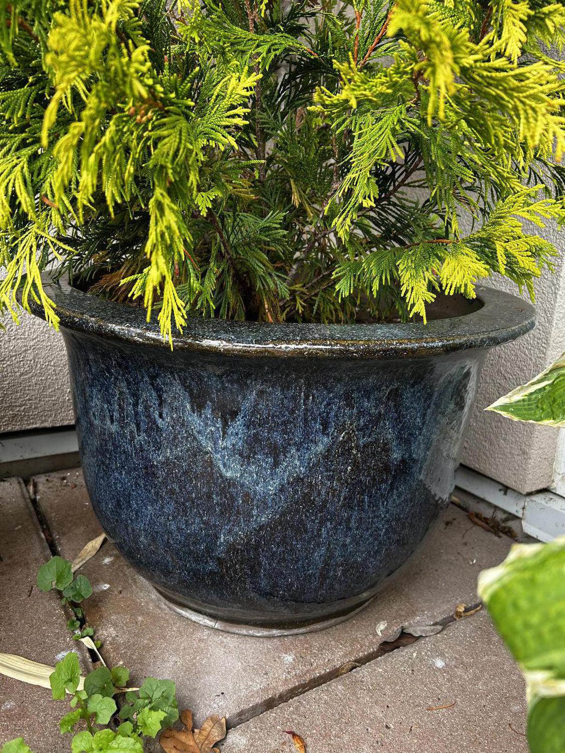 blue glazed potted white cedar tree, approx 4'