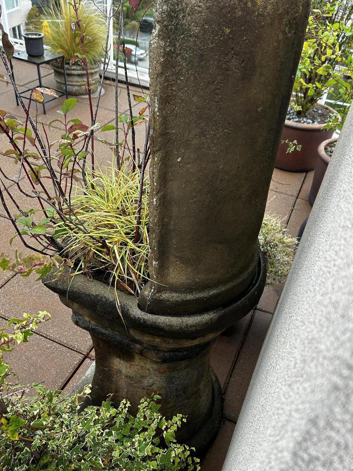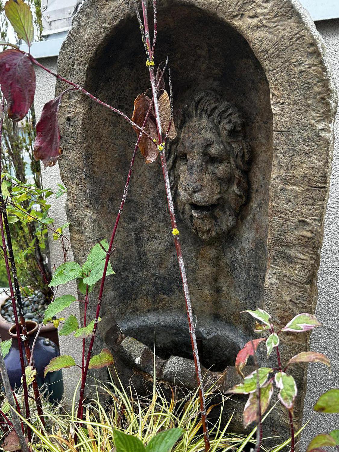large lion motif fountain, in three sections, planted with dogwood, approx. ht. 5'