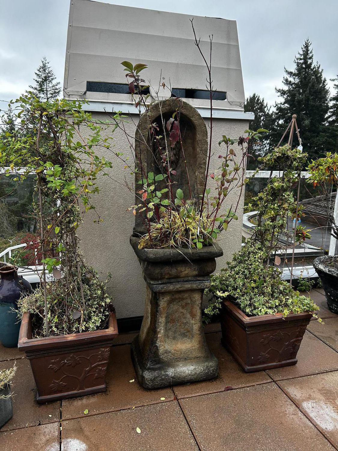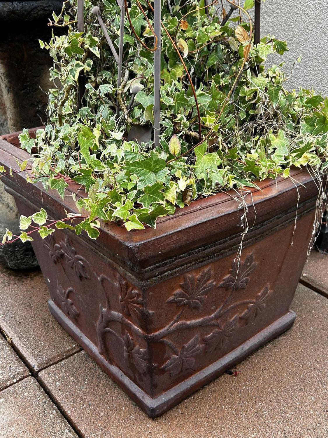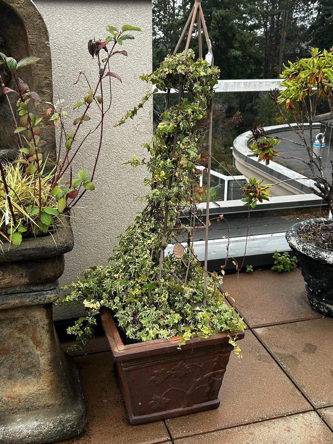 pair of glazed floral planters fitted with metal obelisk trellis, planted with english ivy, white pine and balsam poplar, approx. 6'