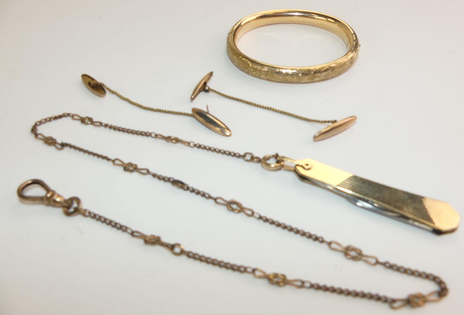 victorian gold filled bangle, pen knife, watch chain and chain cufflinks, circa 1900s