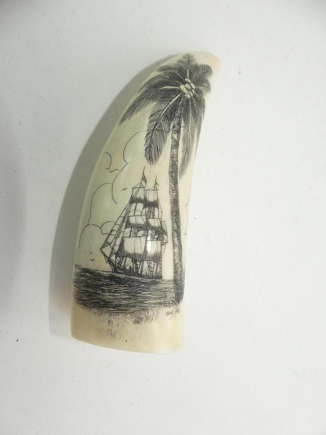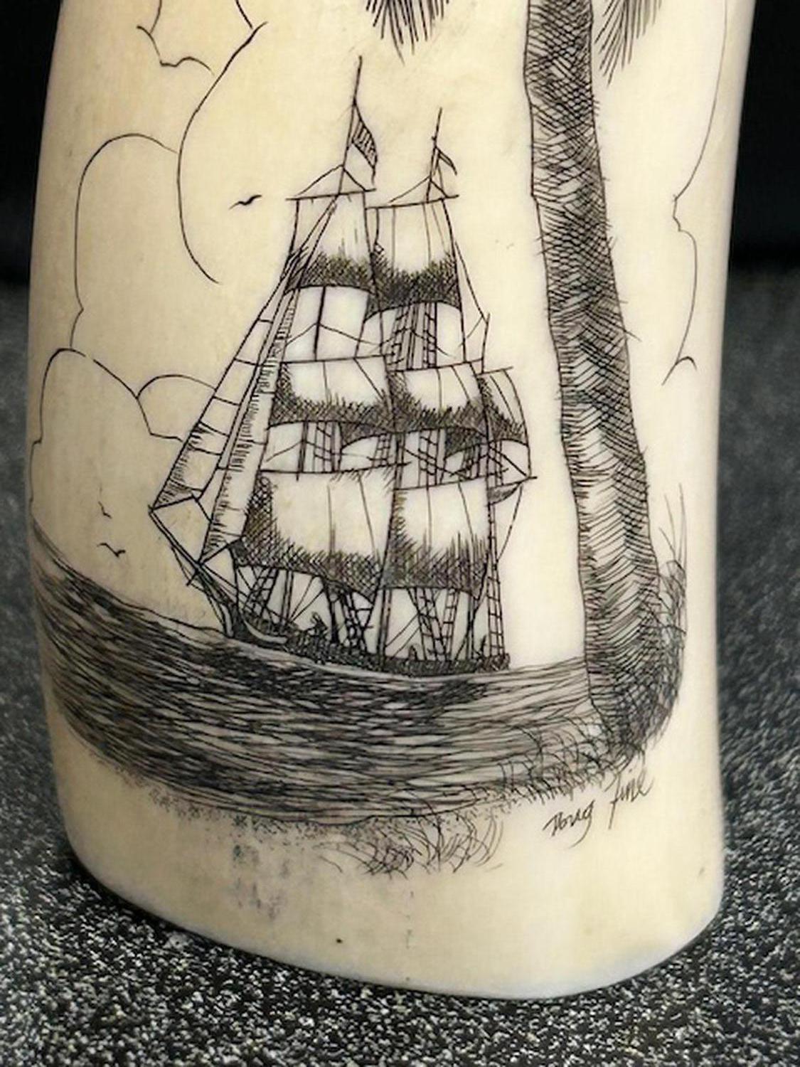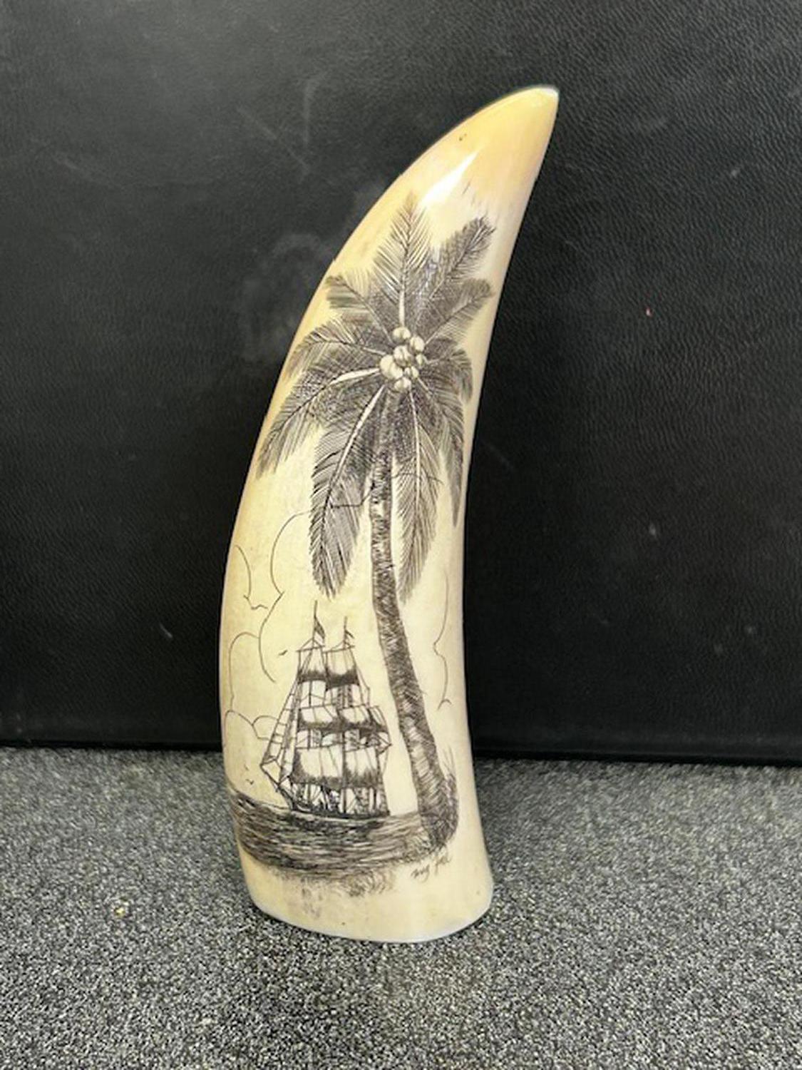 vintage ivory scrimshaw signed doug fine, ht. 4 1/2"