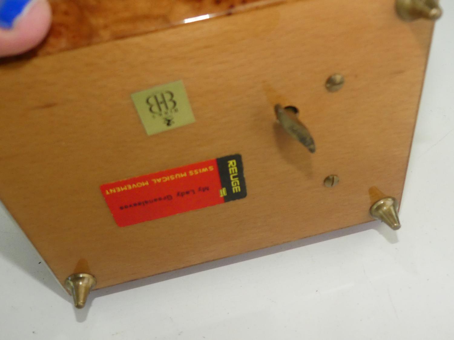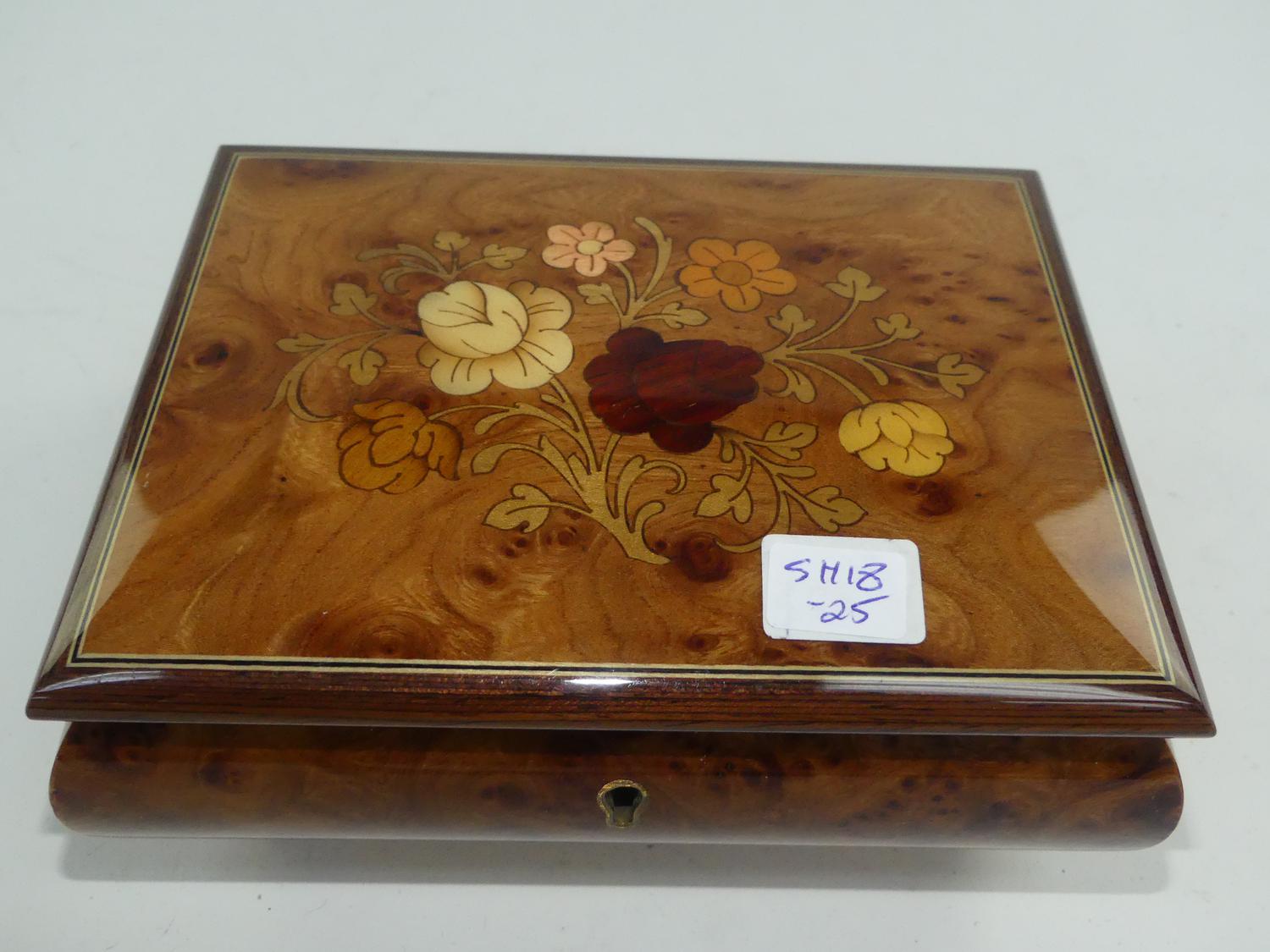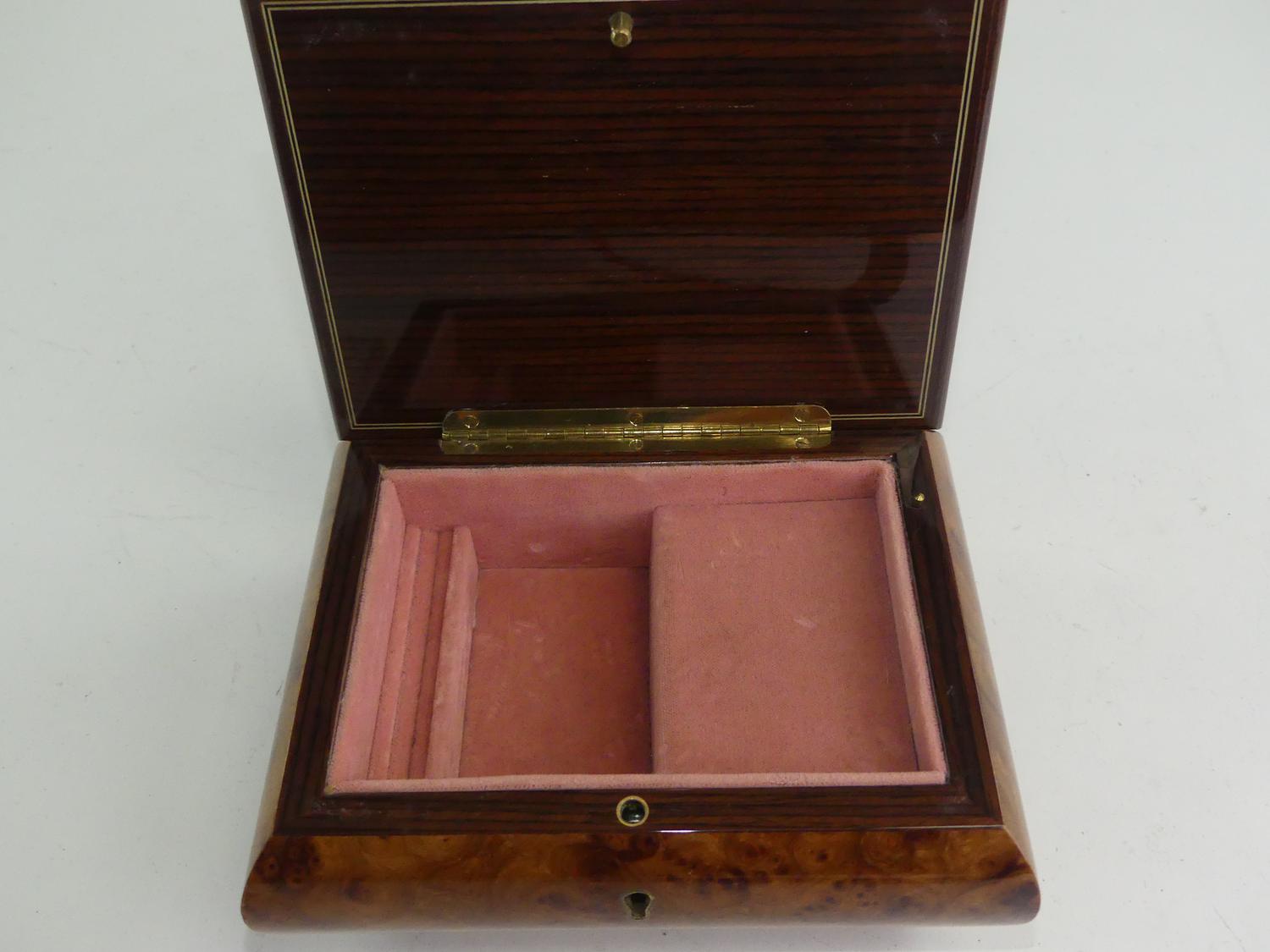 exotic wood musical jewelry box retailed by birks, 3" x 6 1/2" x 5"