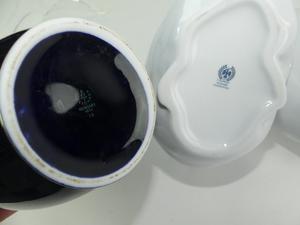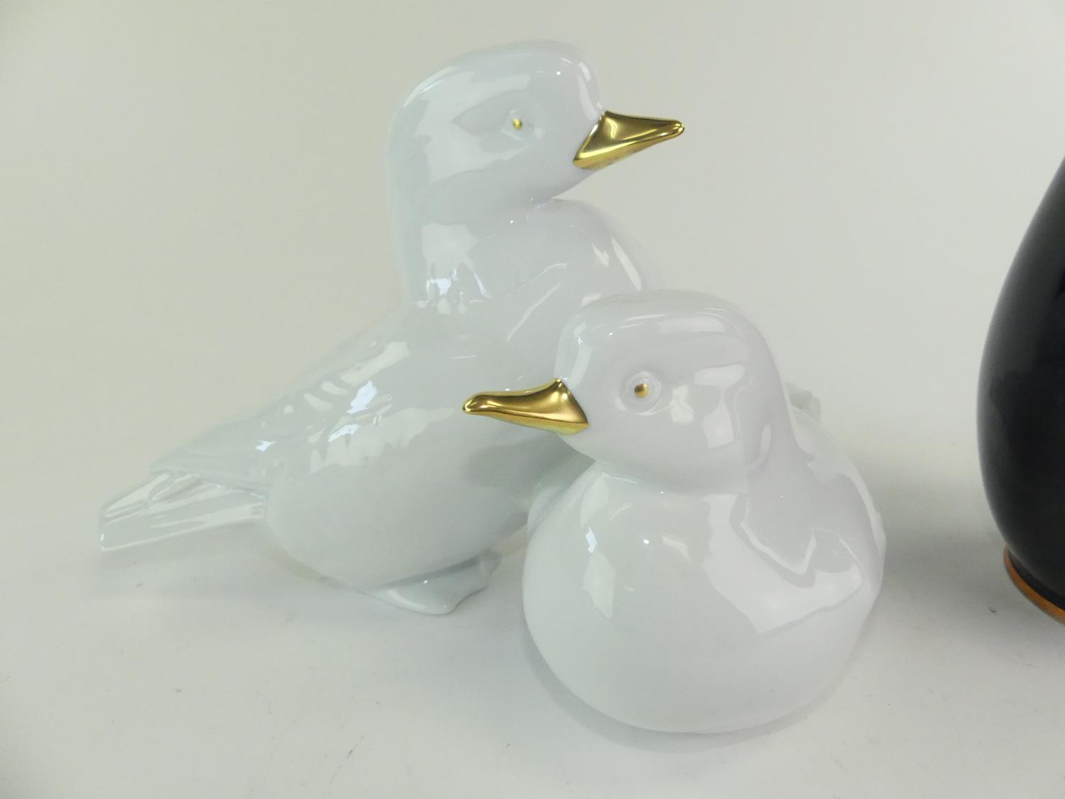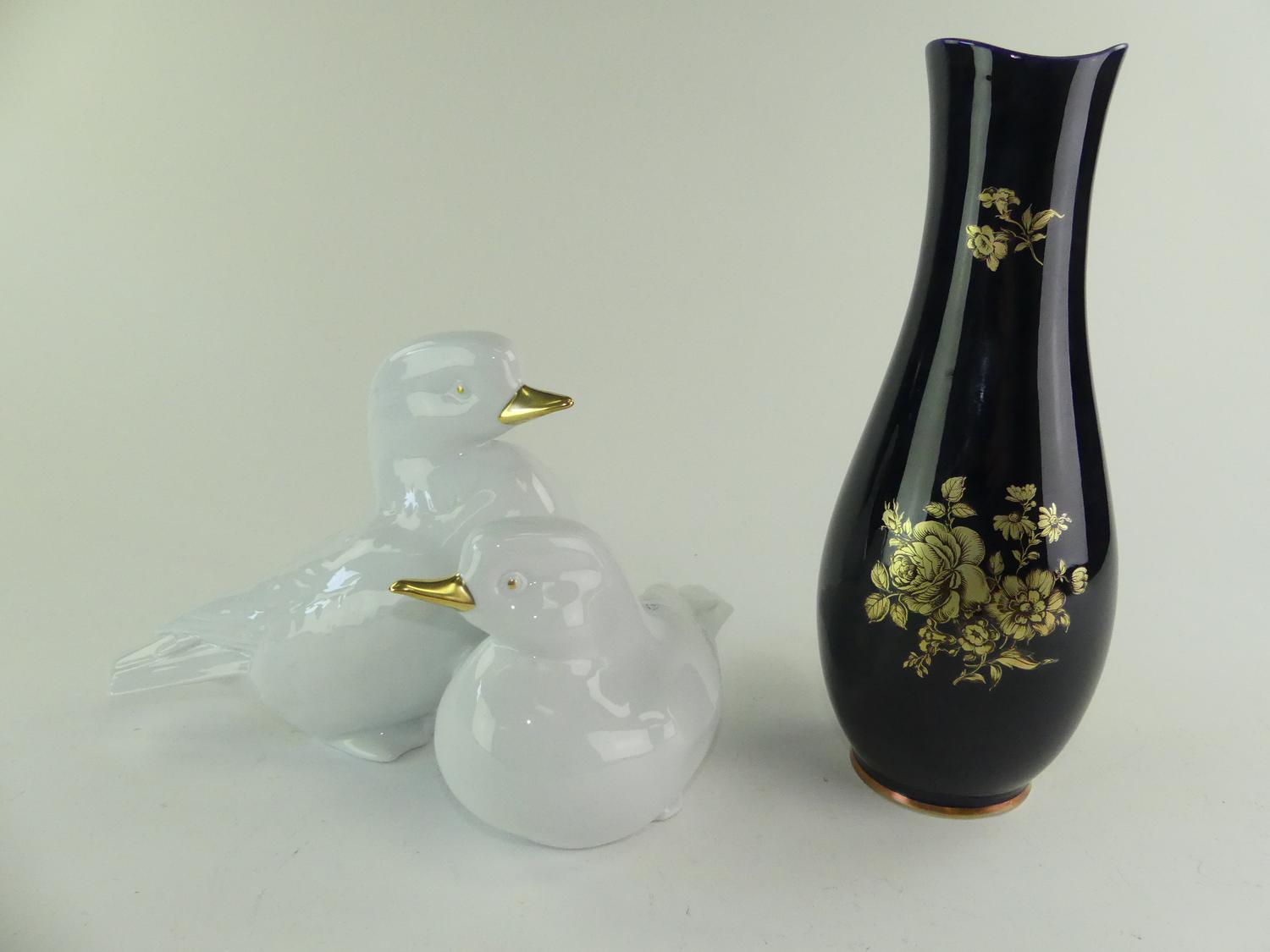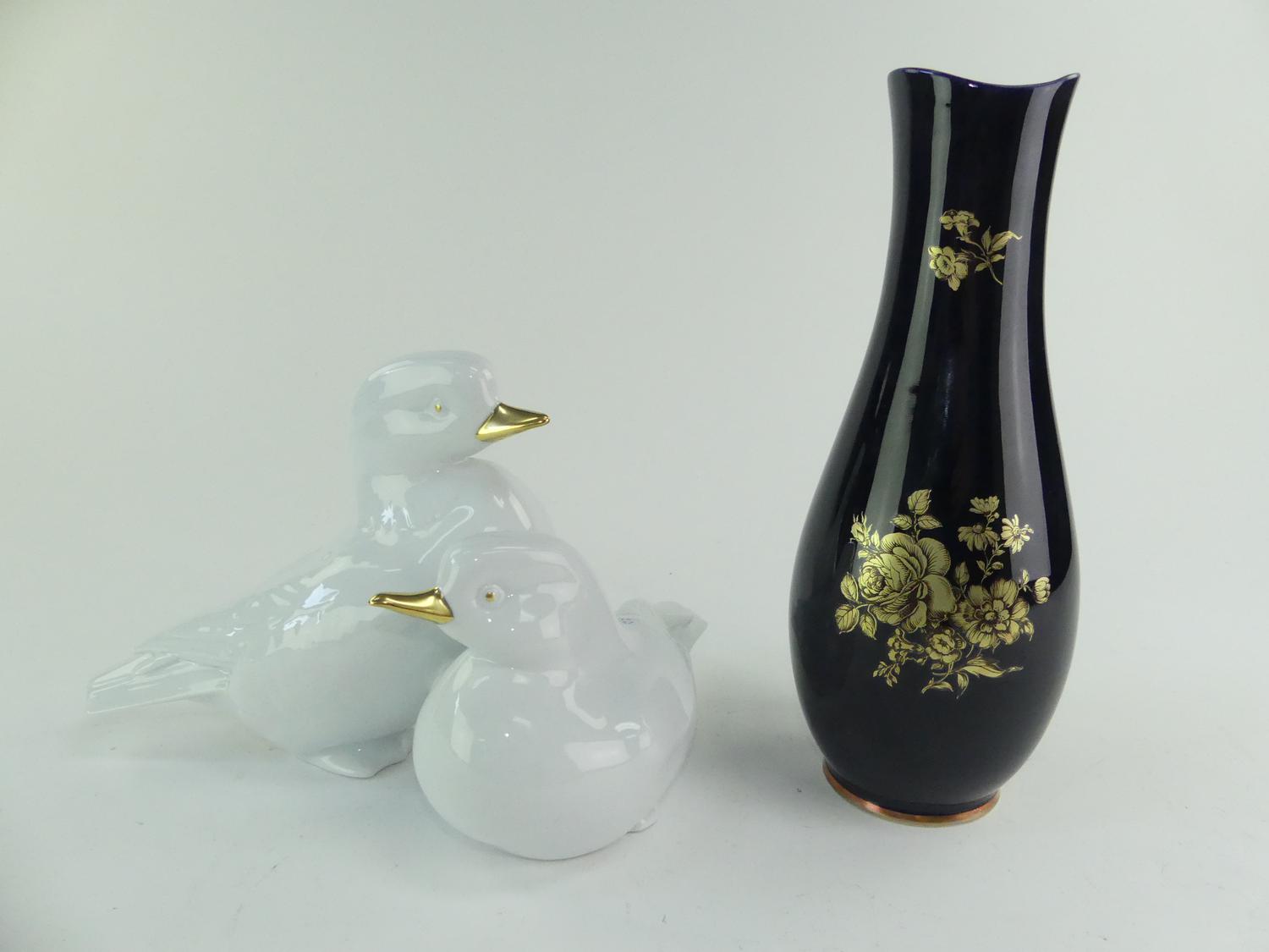 hungarian gilt decorated porcelain group of ducks 8" x 11" together with a hungarian gilt decorated cobalt porcelain vase, ht. 12 1/2"