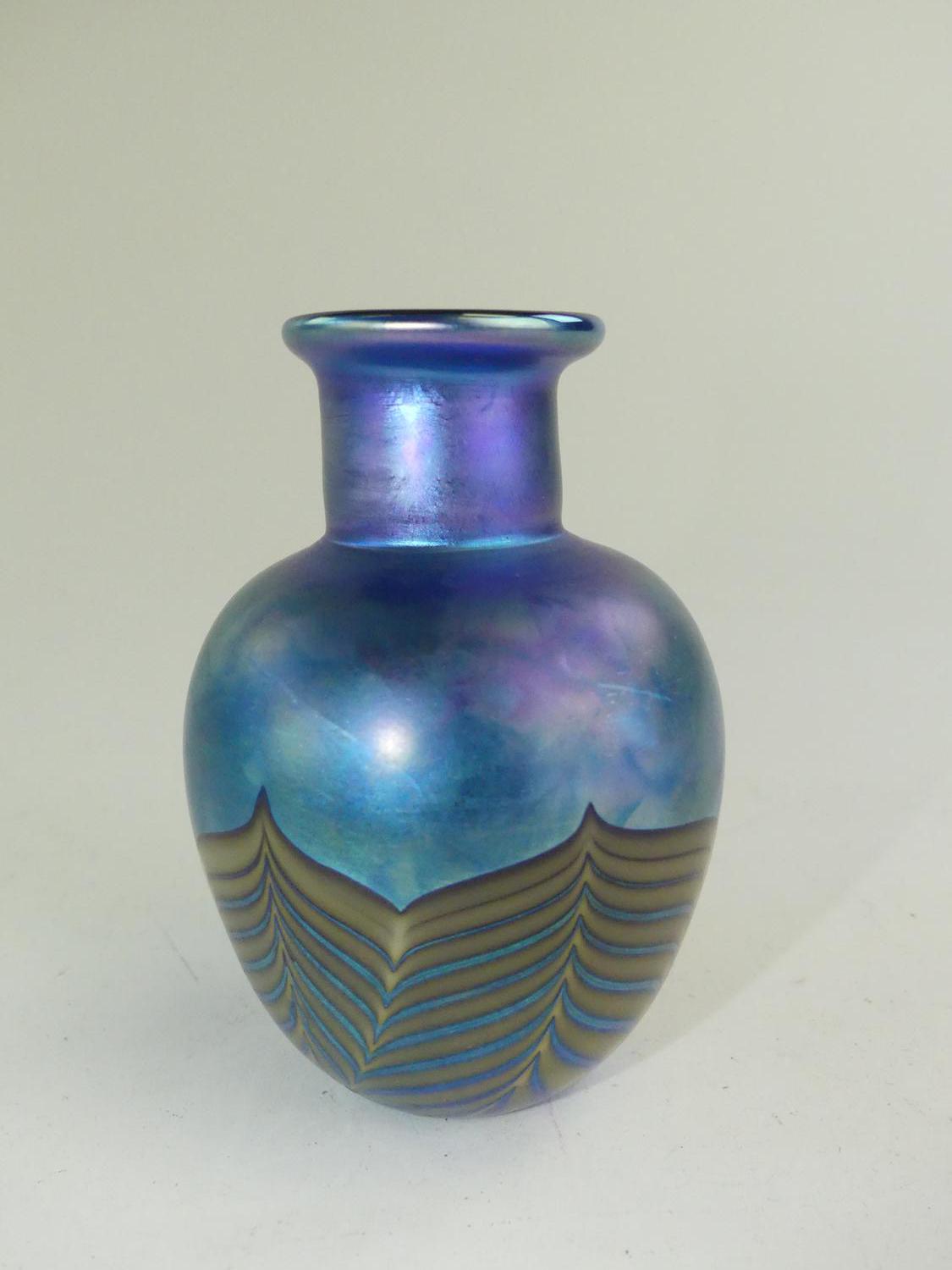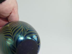 art nouveau style glass vase, signed skoohum, ht. 4"