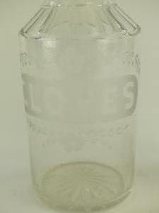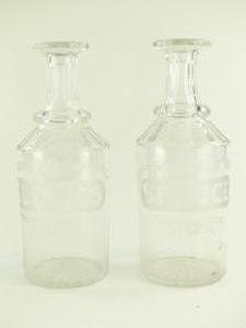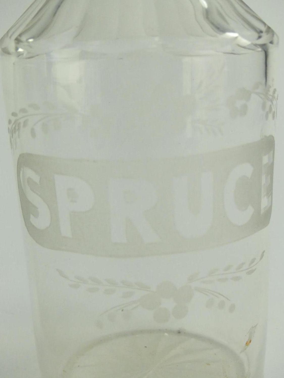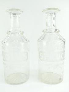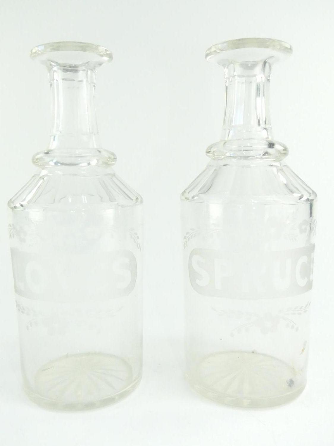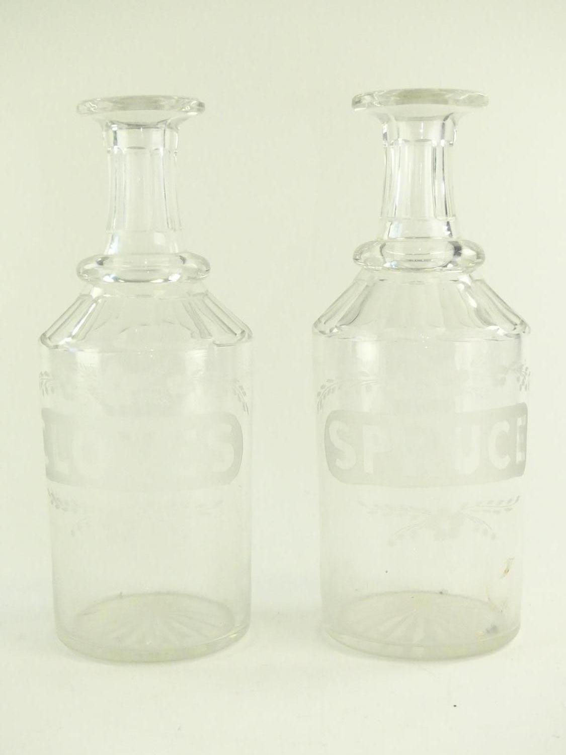 pair of antique etched glass decanters "cloves" & "spruce", ht. 11"