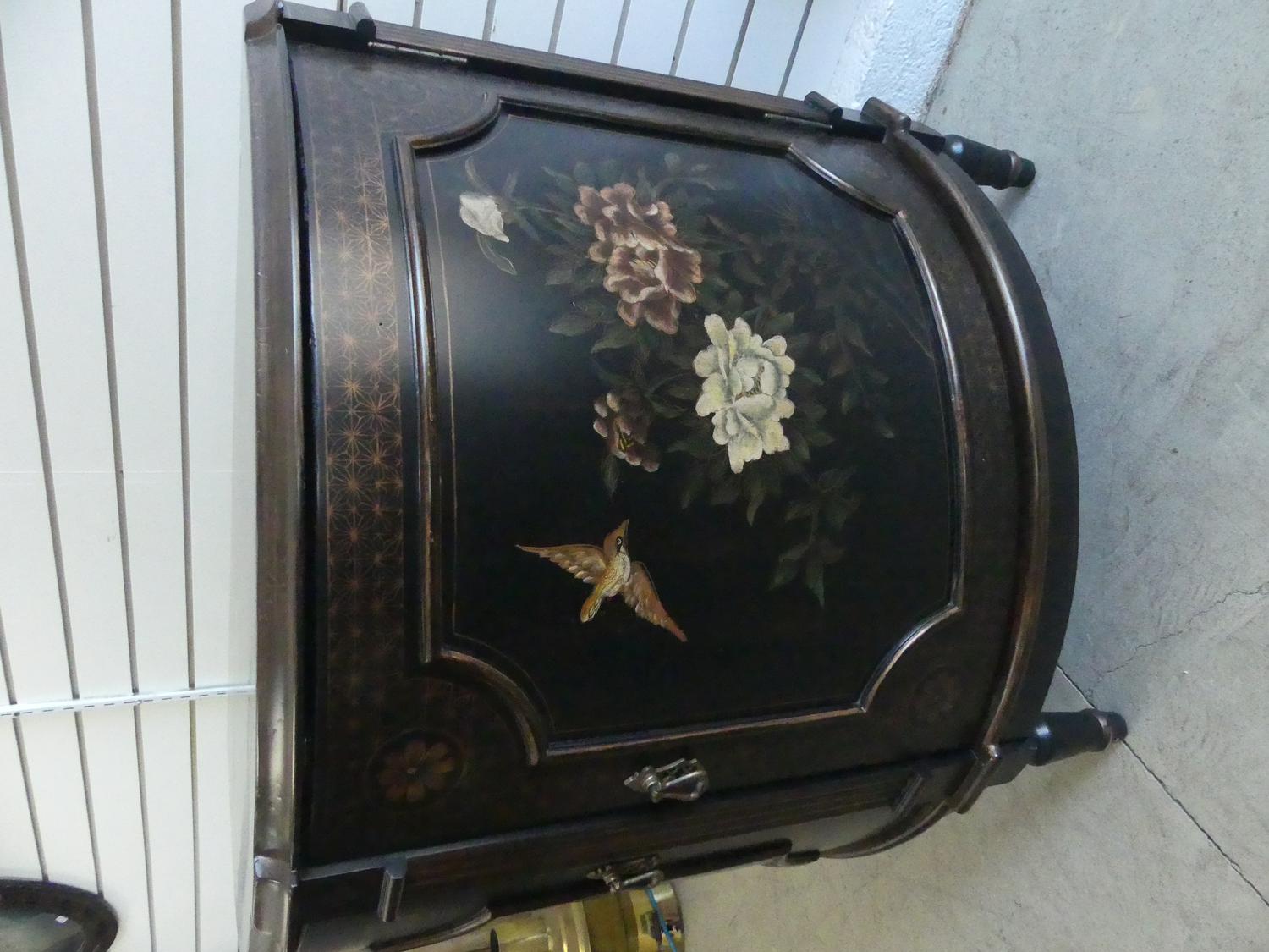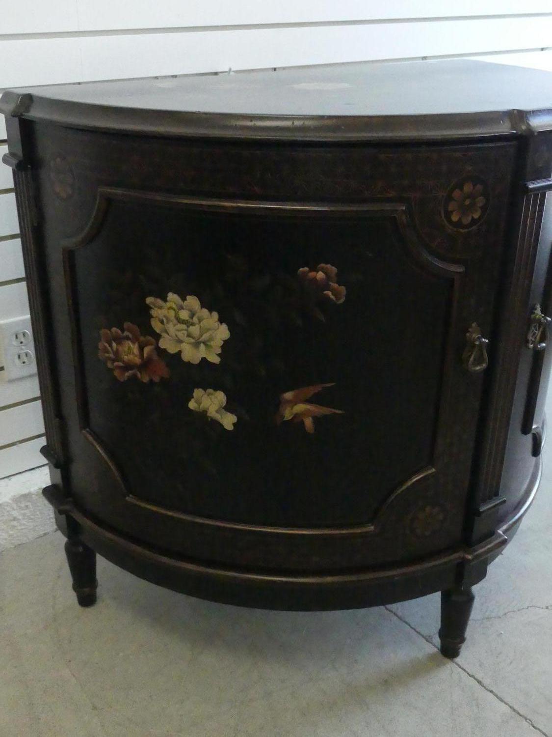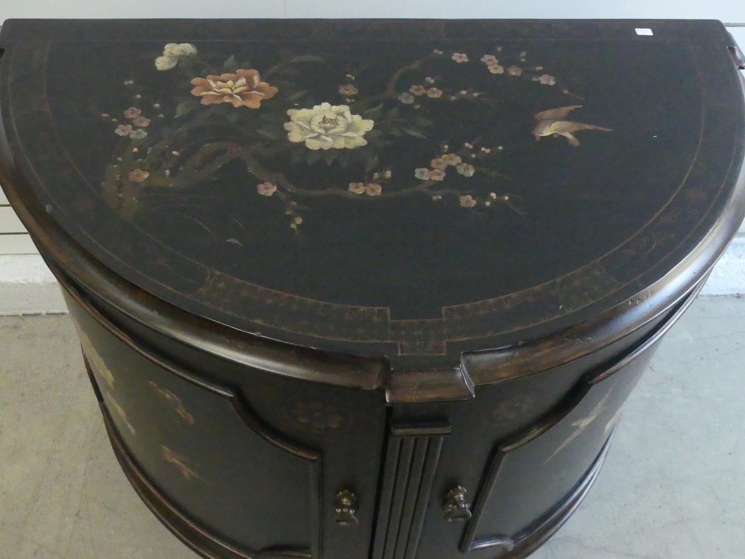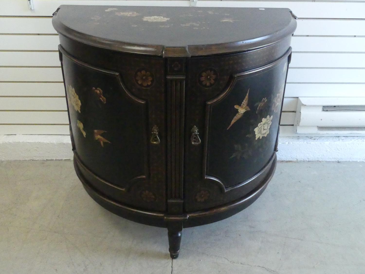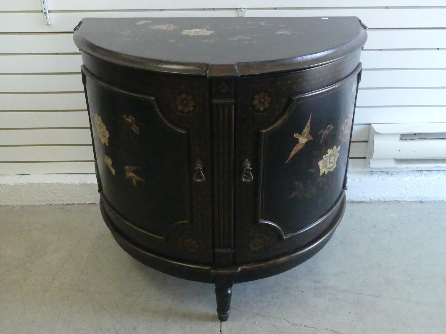chinoiserie decorated demi-lune side cabinet, 32" x 35" x 20"