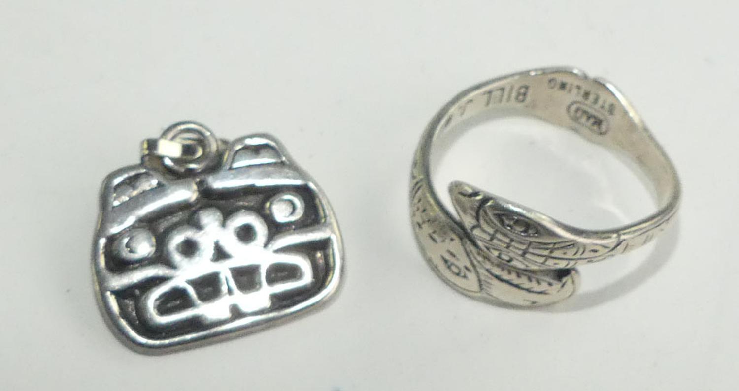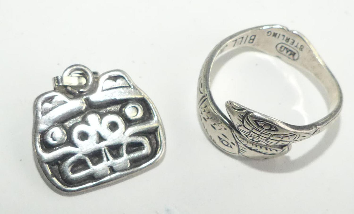 haida sterling silver ring and pendant, ring signed b. j. wilson