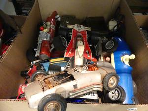 lot of toy race cars and other vintage toys