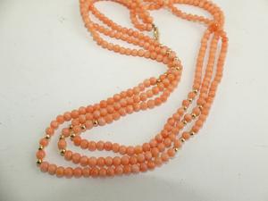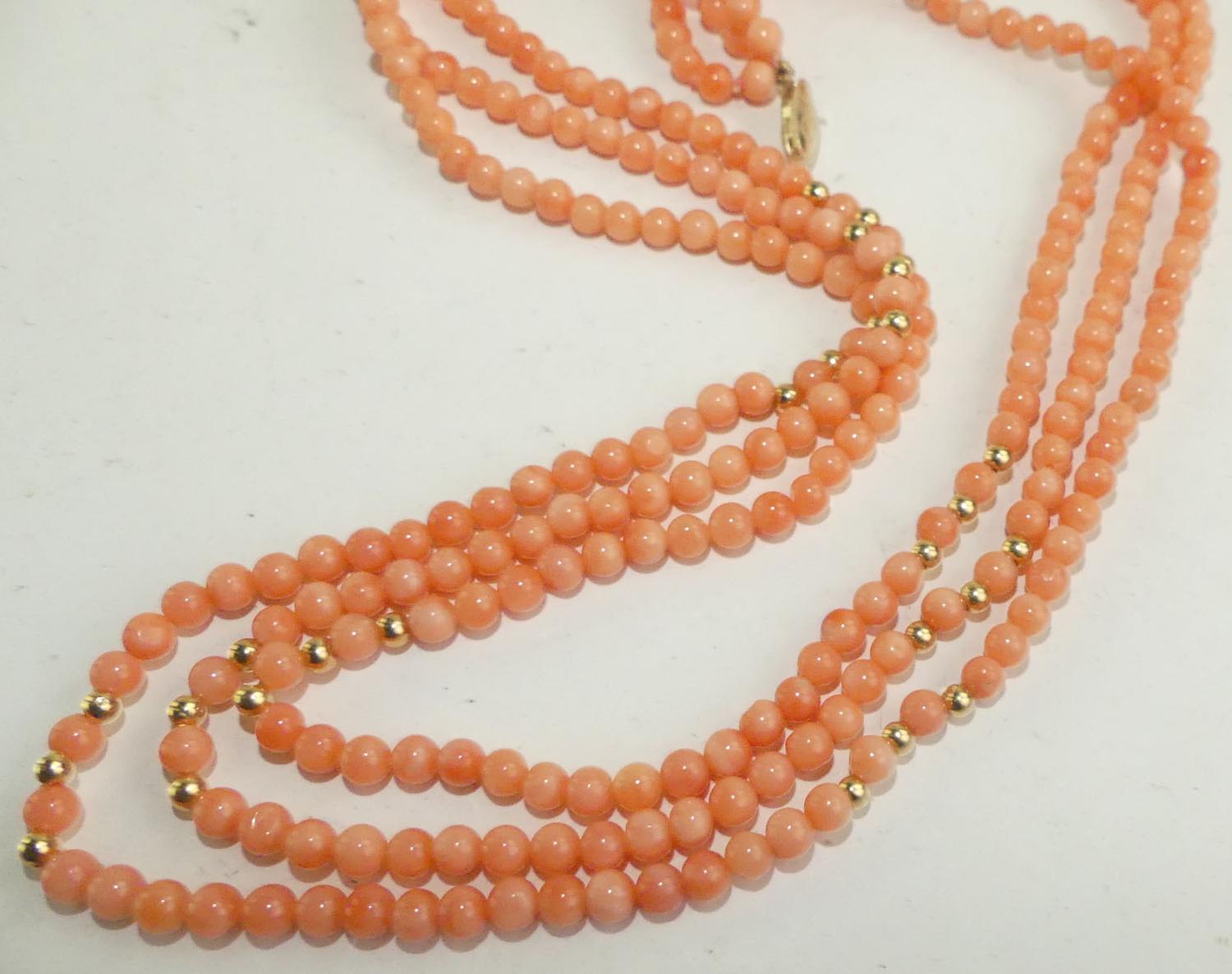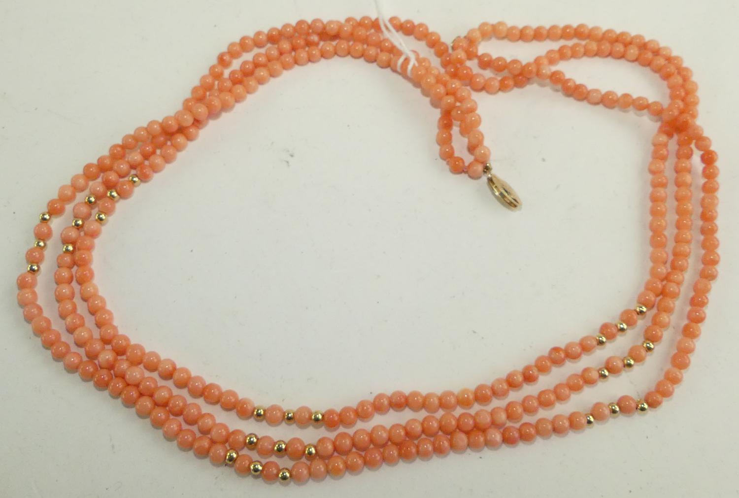 triple strand coral and 14k yellow gold bead necklace, length 18"