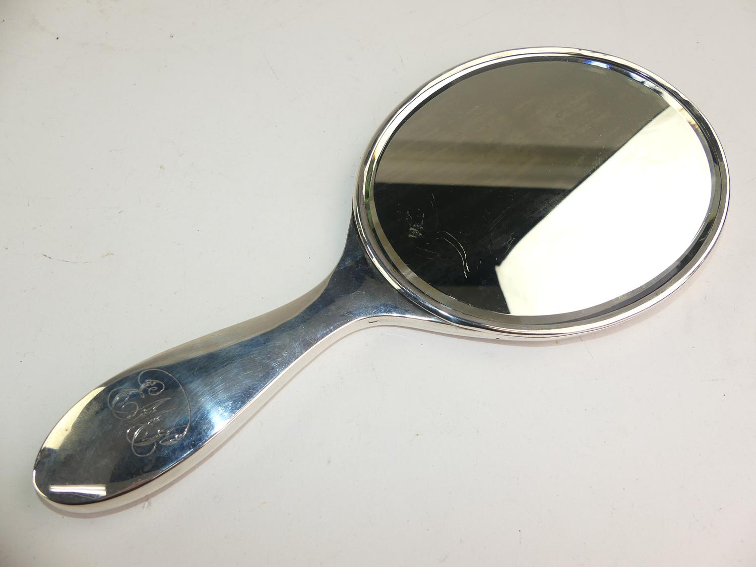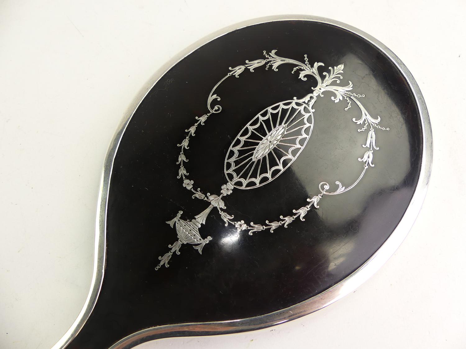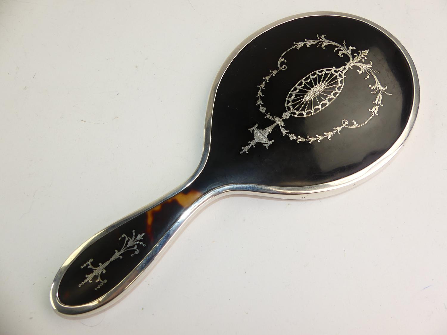 a fine george v sterling silver inlaid tortoise shell hand mirror, walker & hall, birmingham 1920, length 11 1/2"