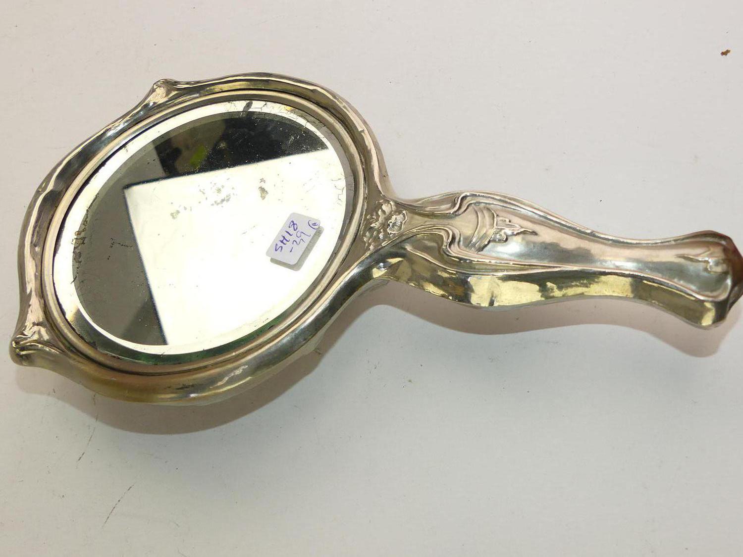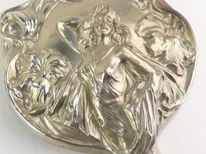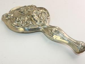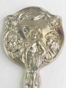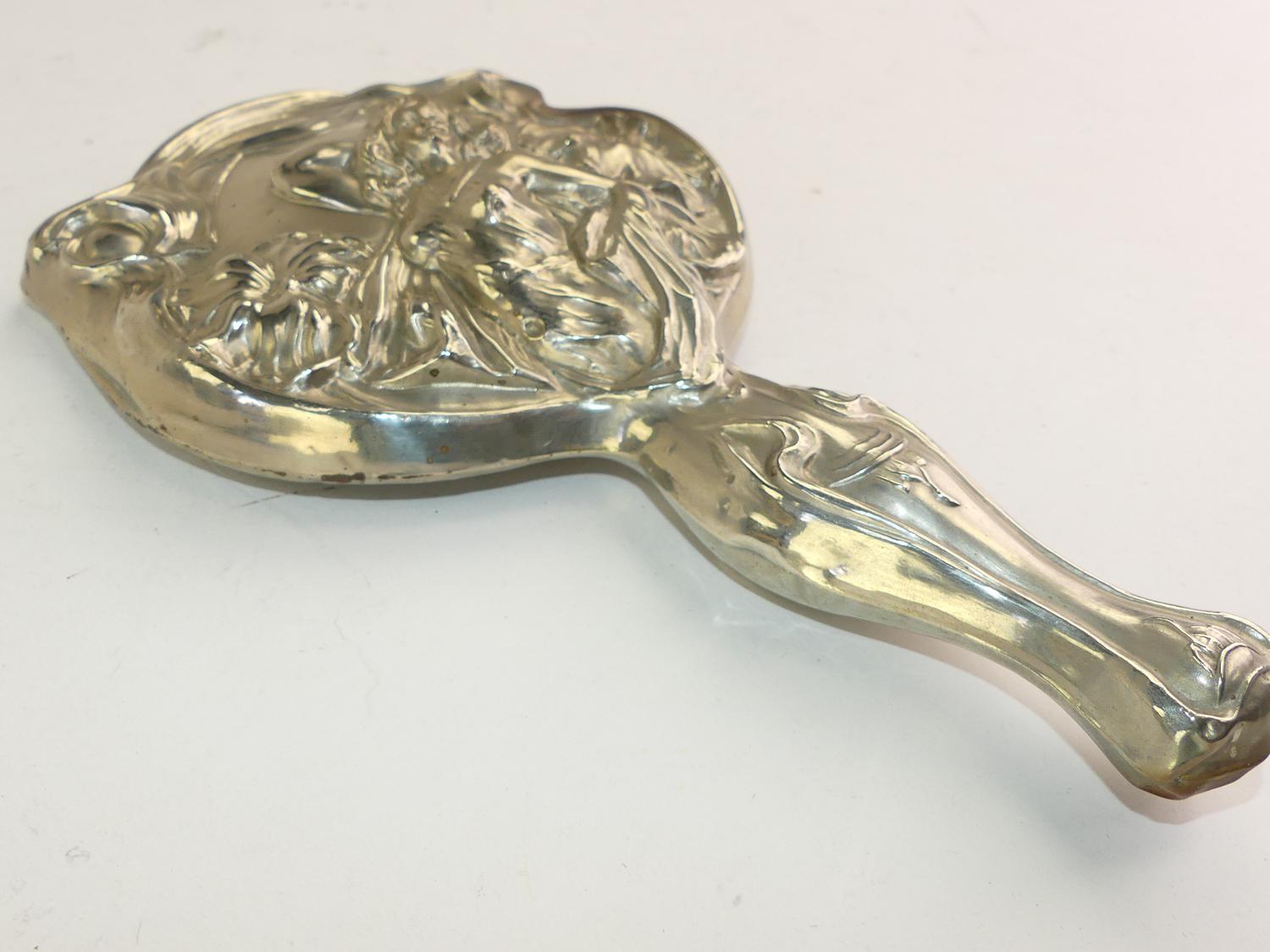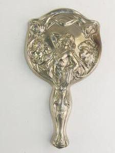 art nouveau "silverine" figural hand mirror, ht. 10"