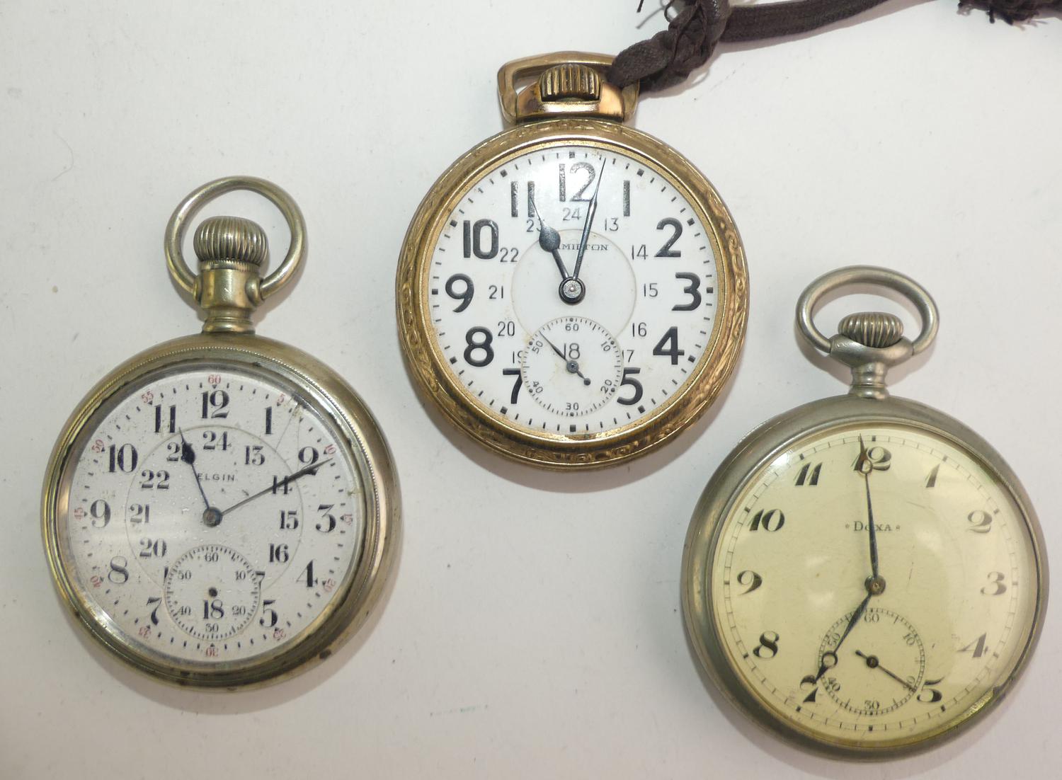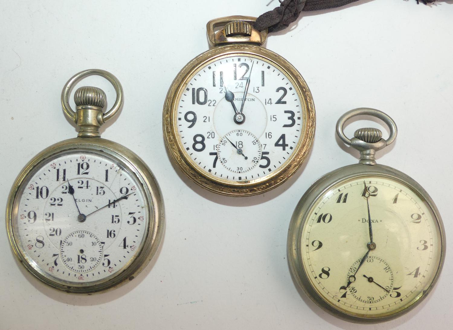 3 victorian openfaced pocketwatches, elgin, hamilton, doxa