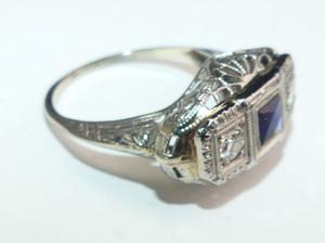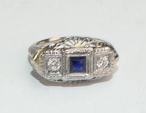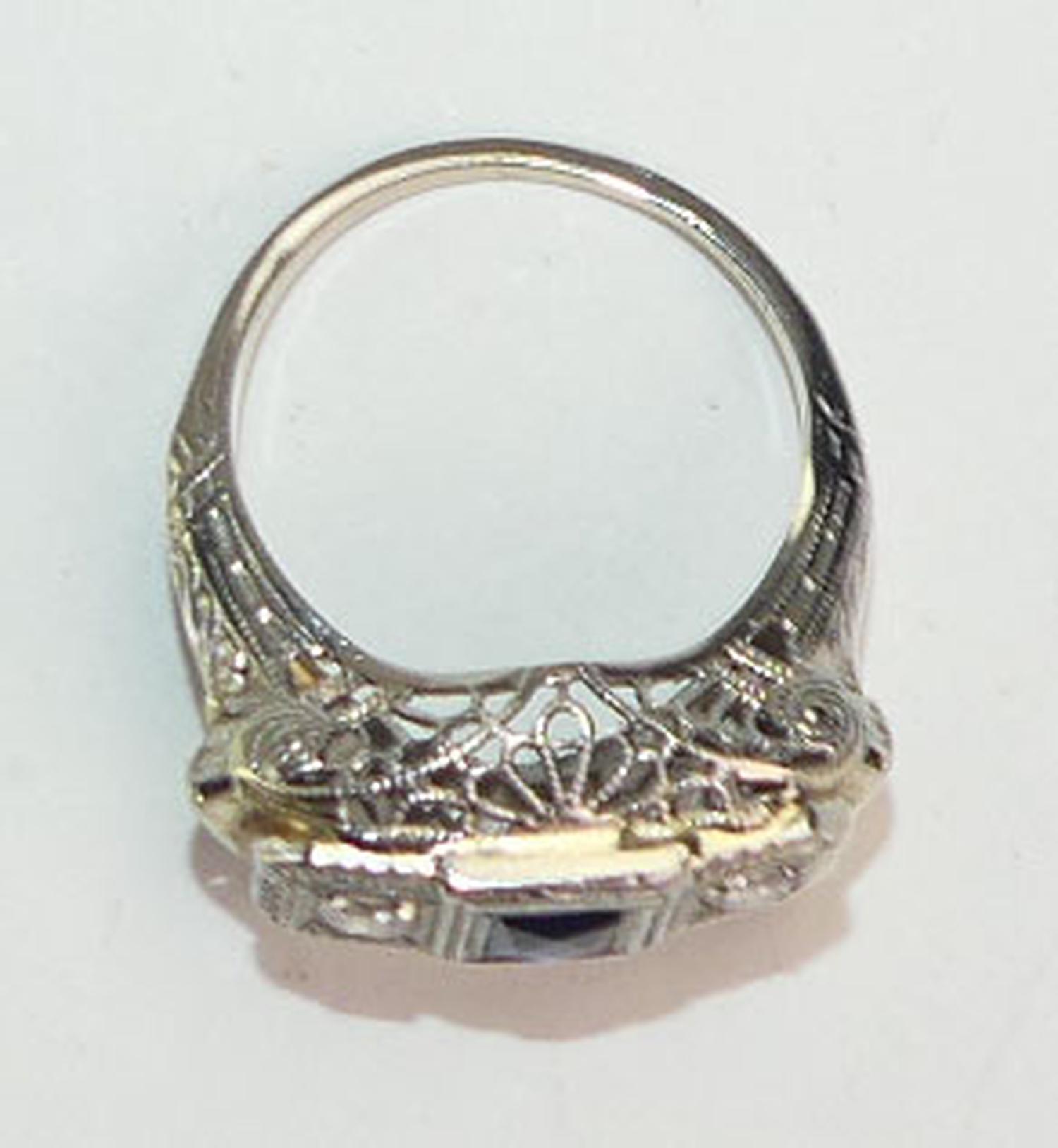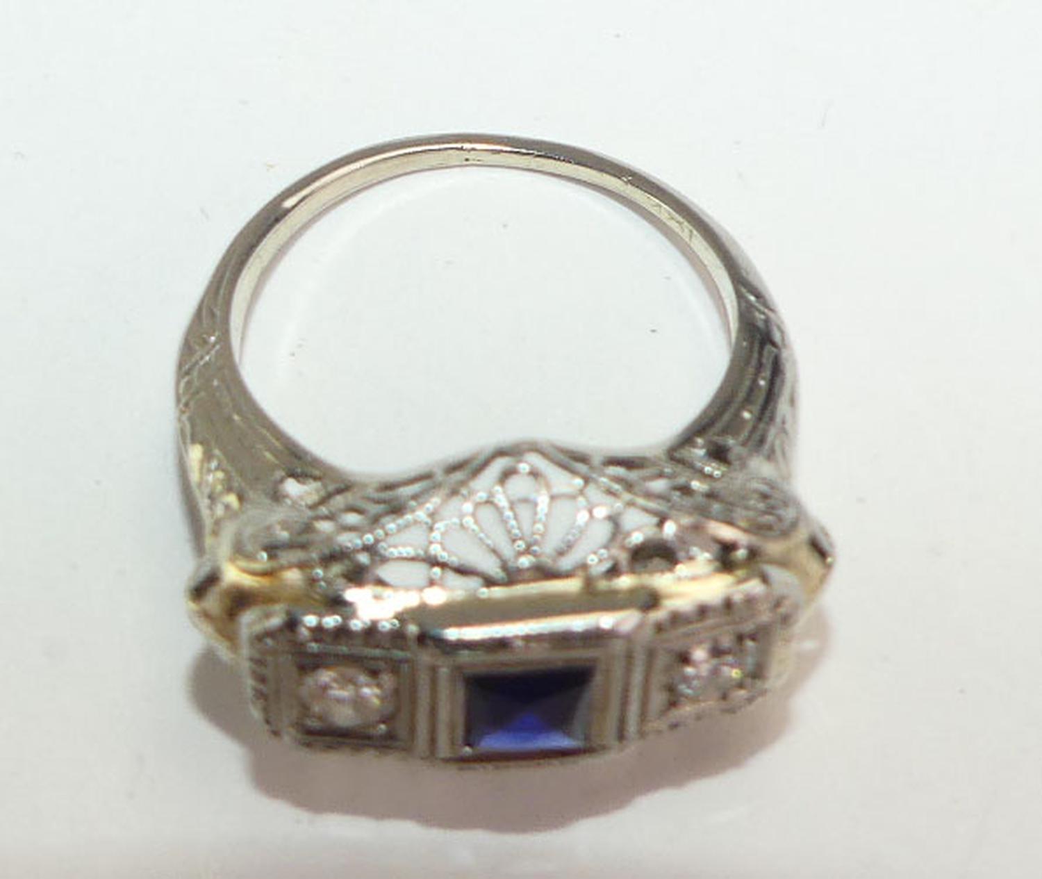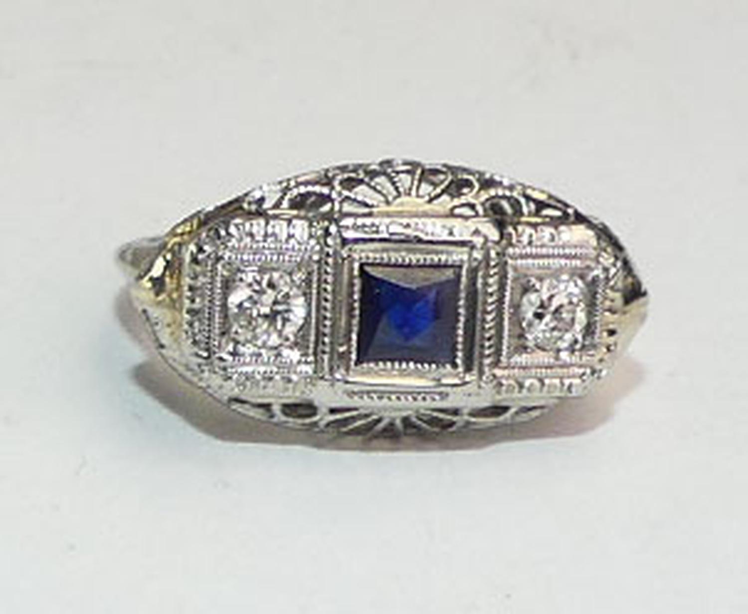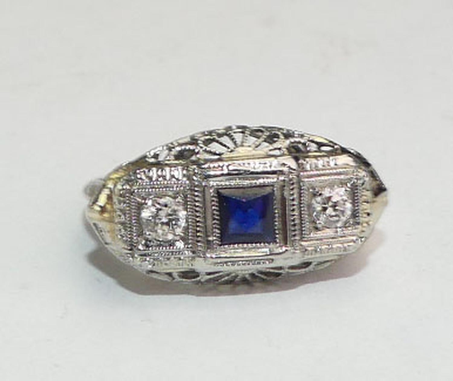 art deco 18k white gold filigree diamond sapphire ring, size 4 1/4, weighing approx 2.2 grams