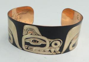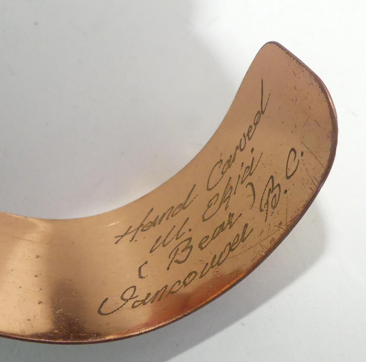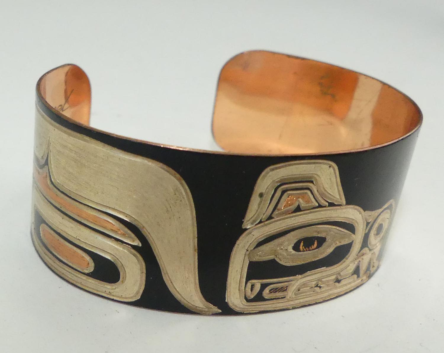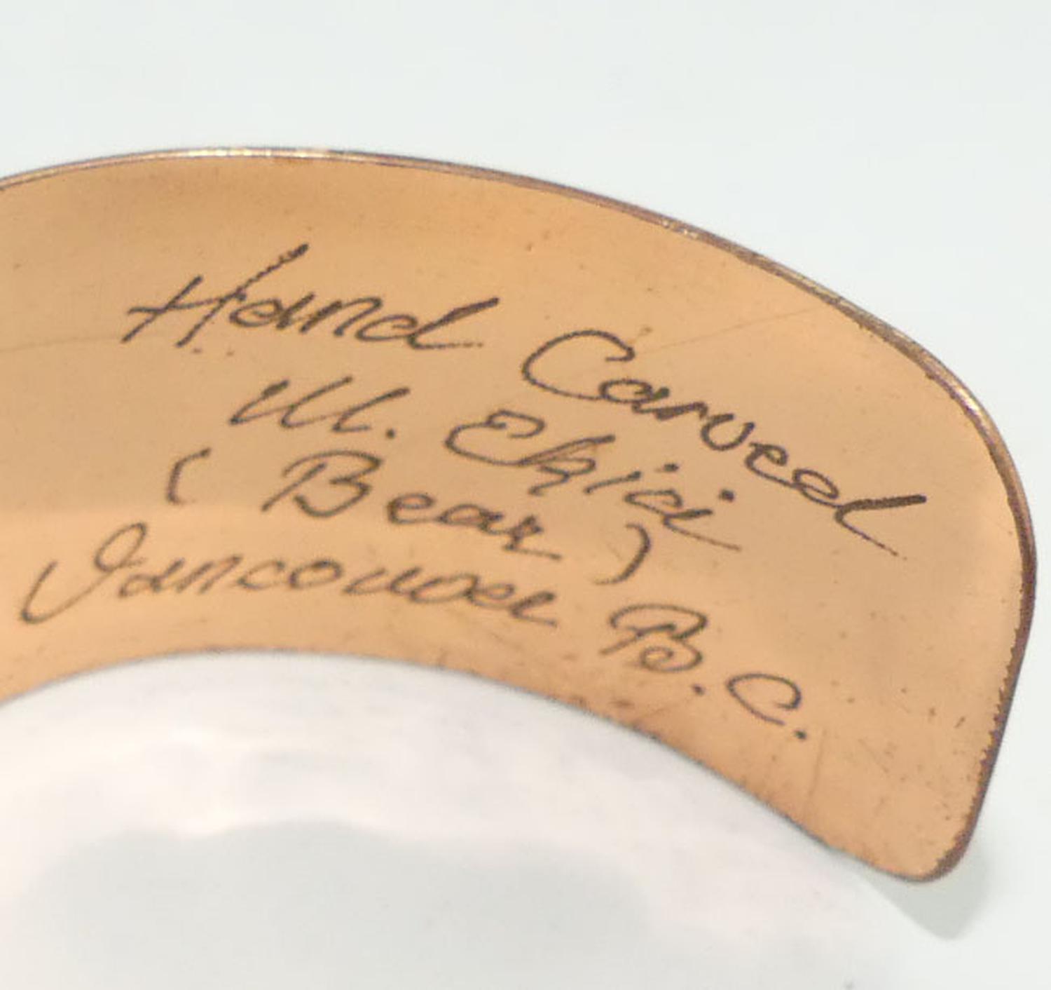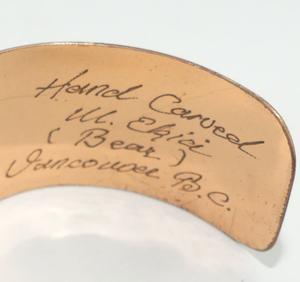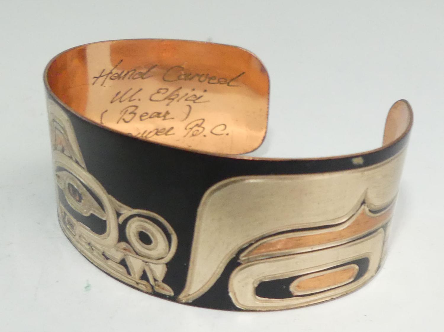 native mixed metal cuff bracelet signed "hand carved, m. elgini, bear, vancouver bc", width 1"