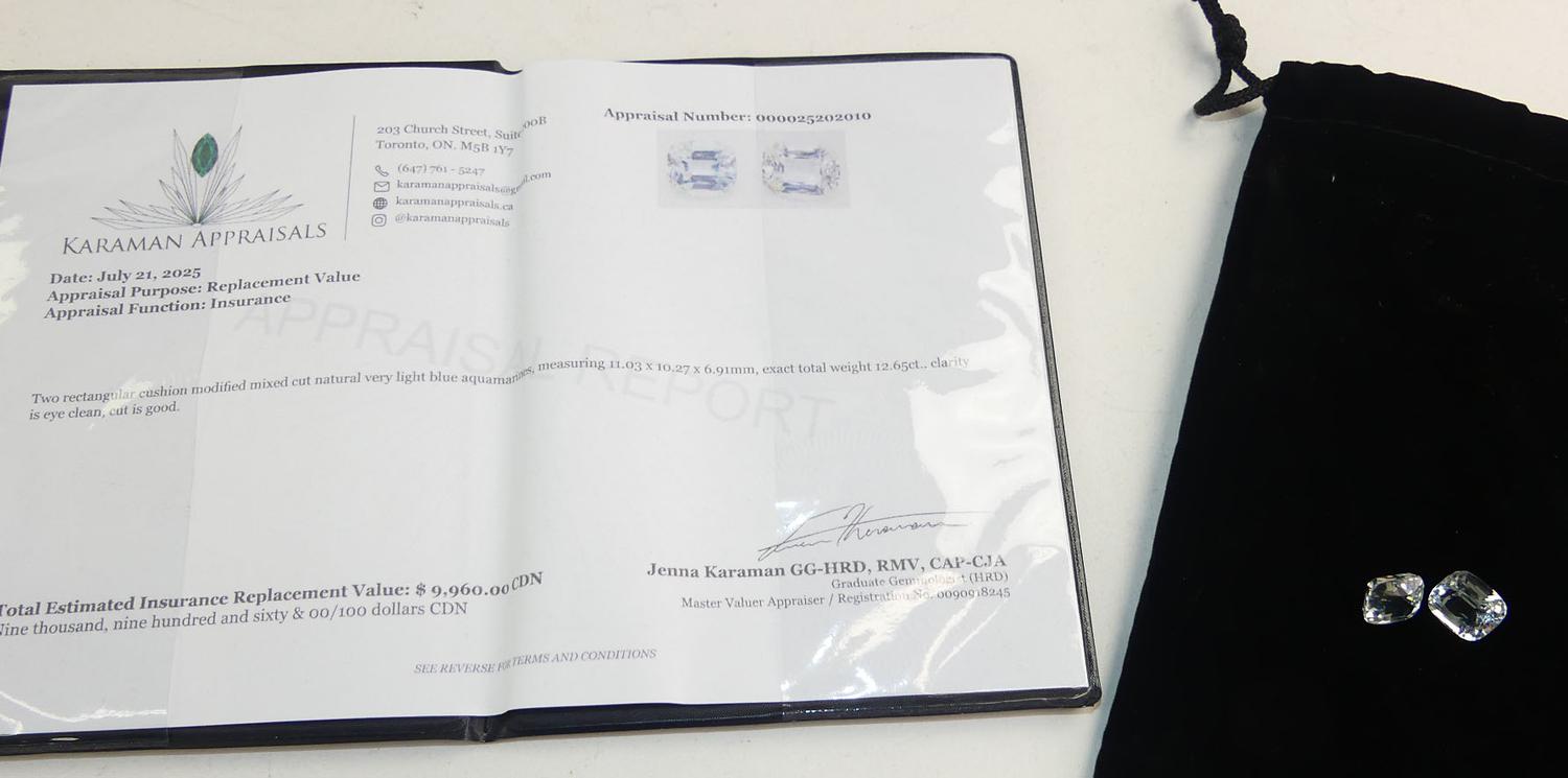 2 unmounted aquamarines, 12.65cts, with appraisal
