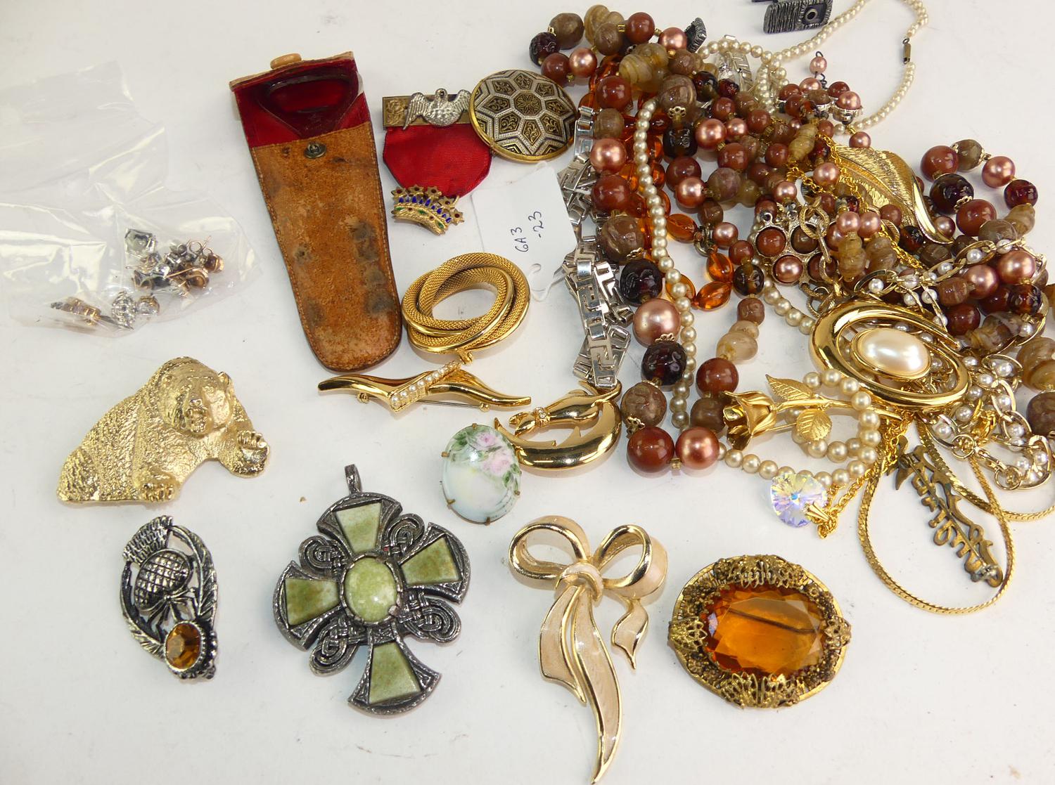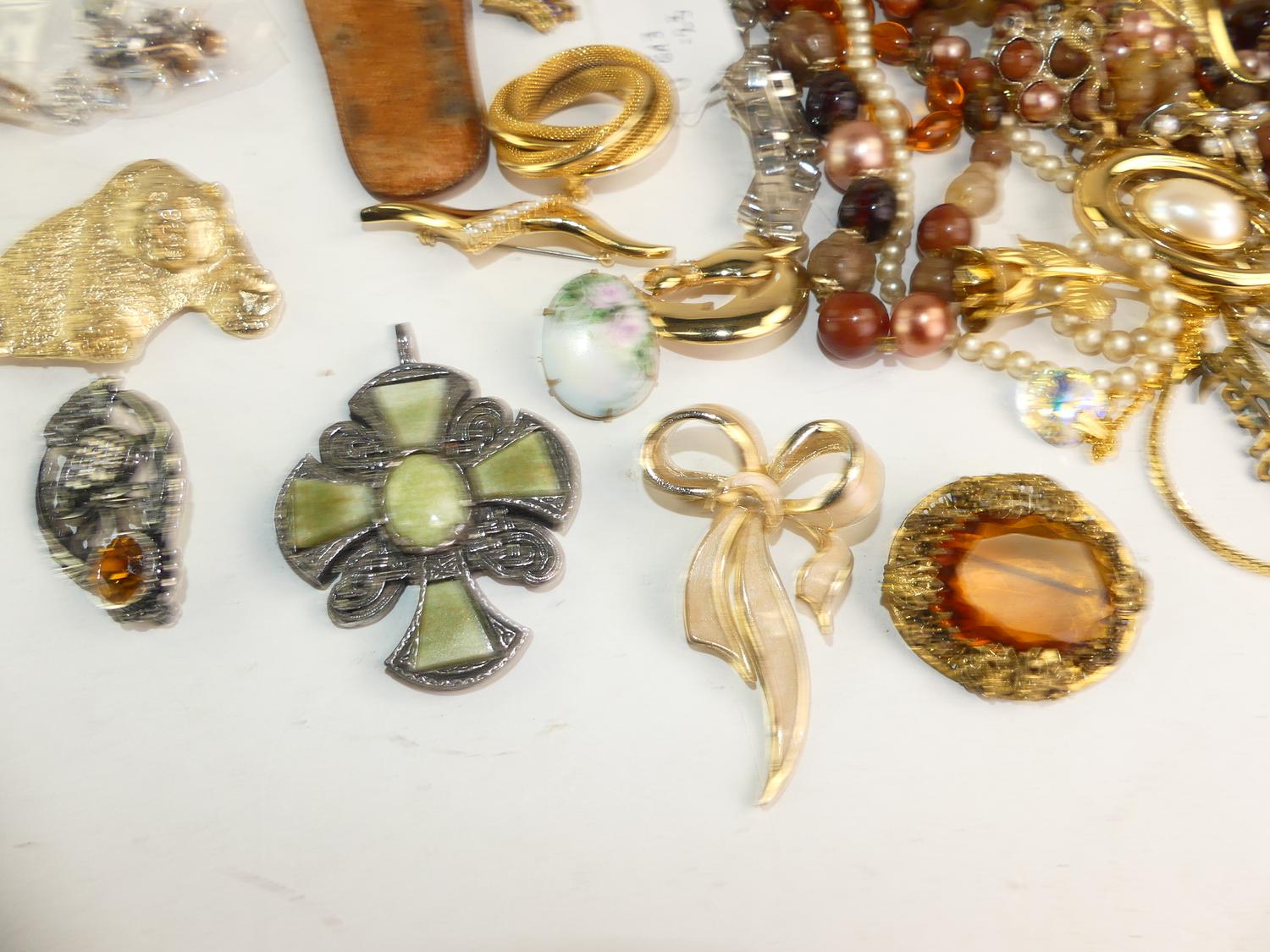 large lot of costume jewelery including glass necklace, mizpah brooches