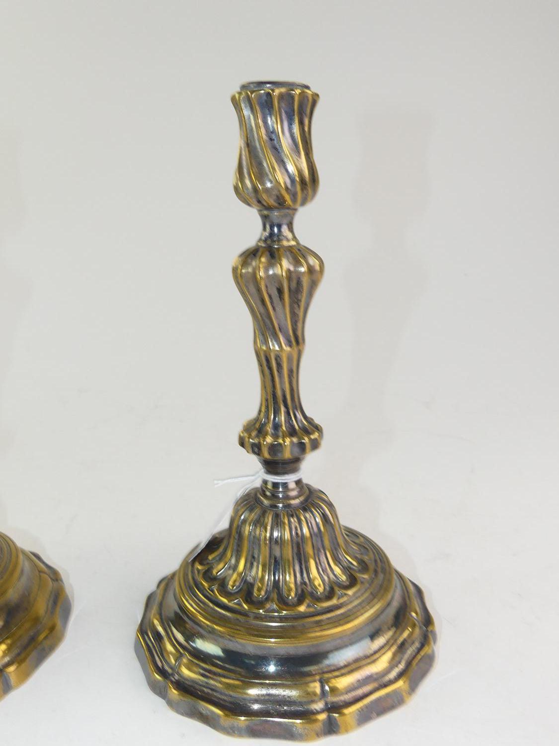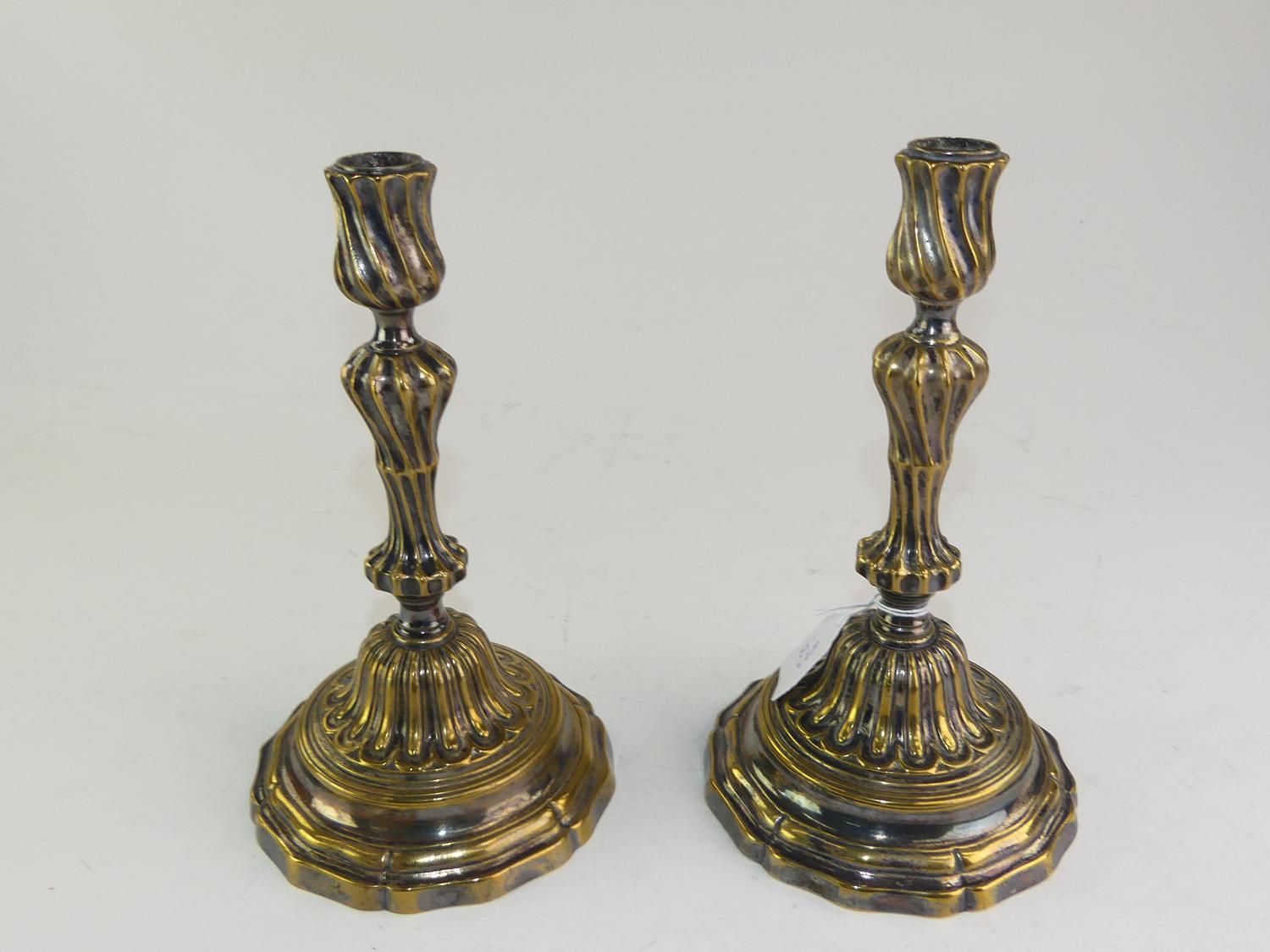 pair of antique silver plate on brass candle sticks, showing fabulous wear!, ht. 10"