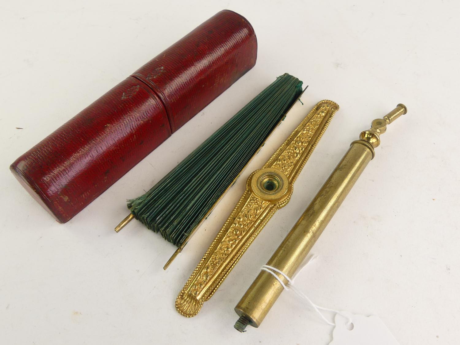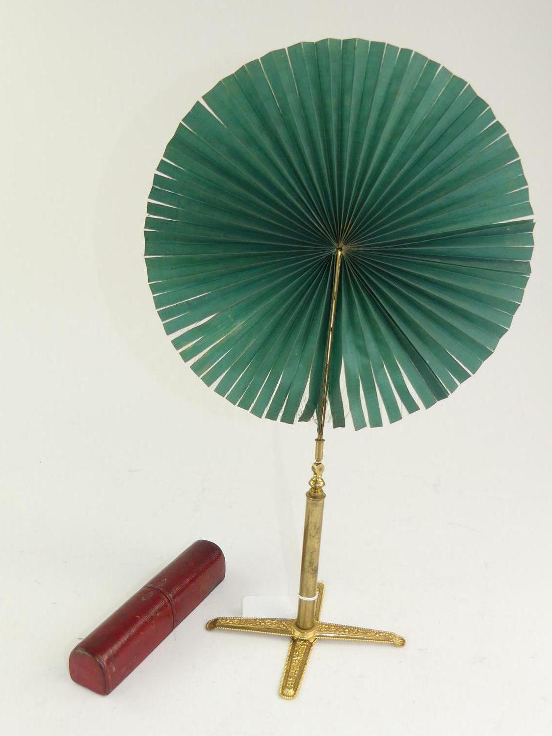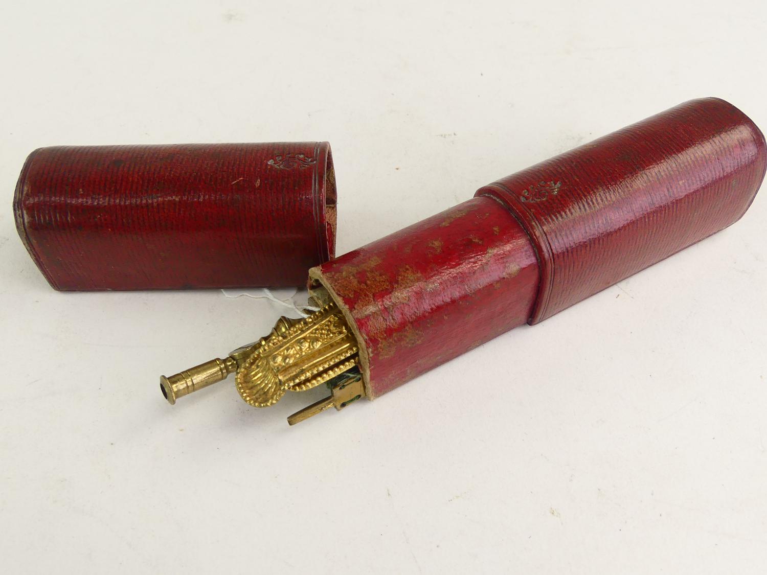 victorian folding adjustable travel firescreen in fitted red leather case, case 6 1/4", ht. 23"