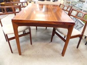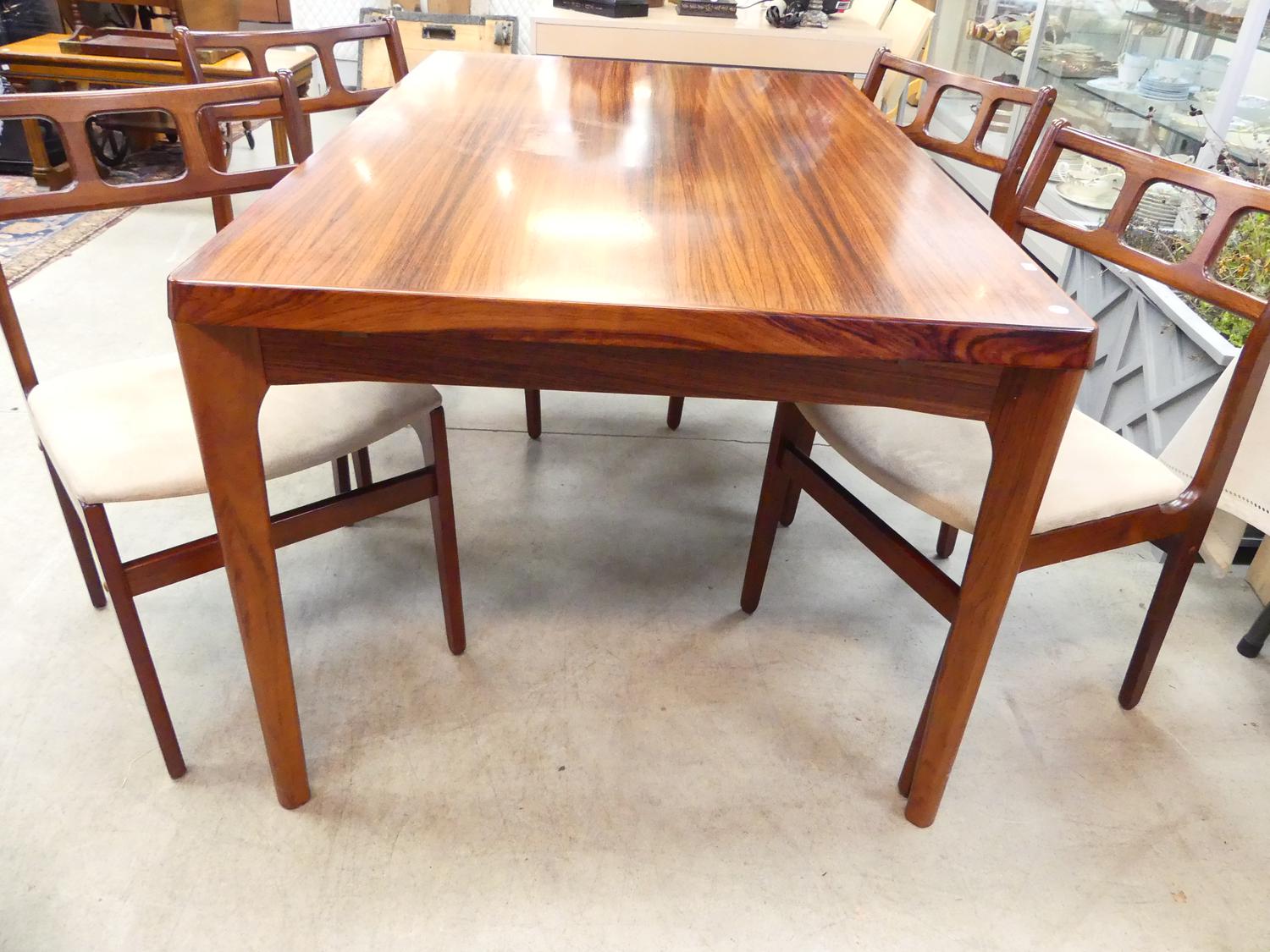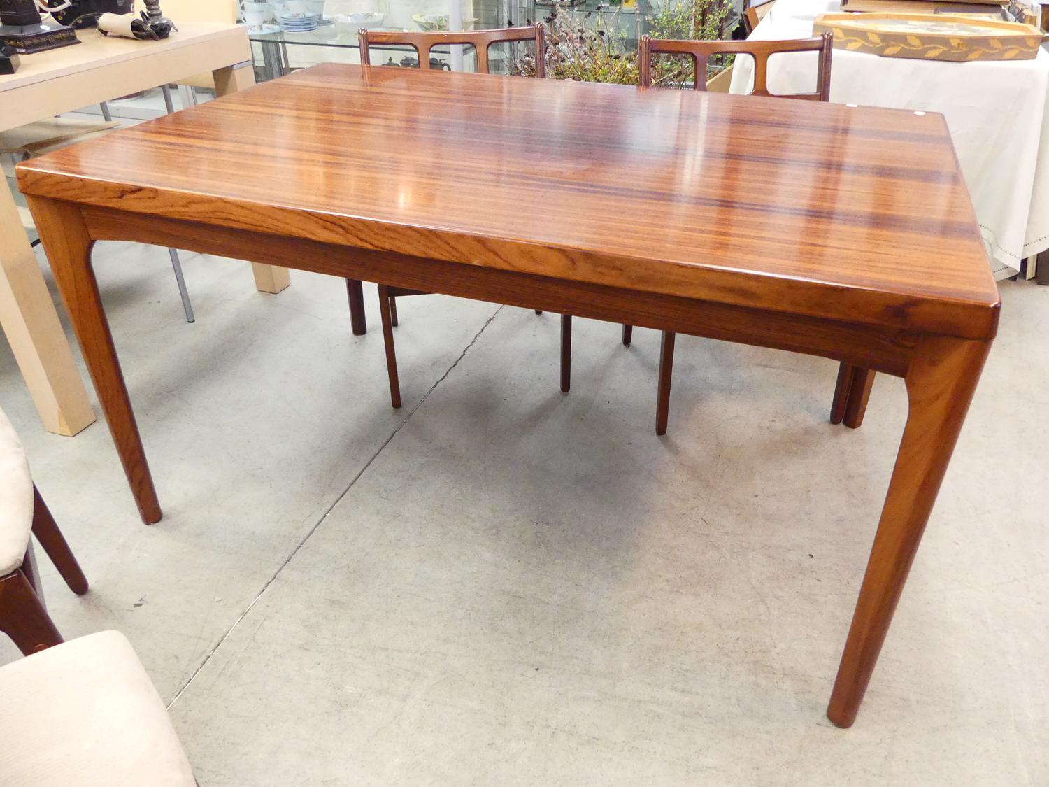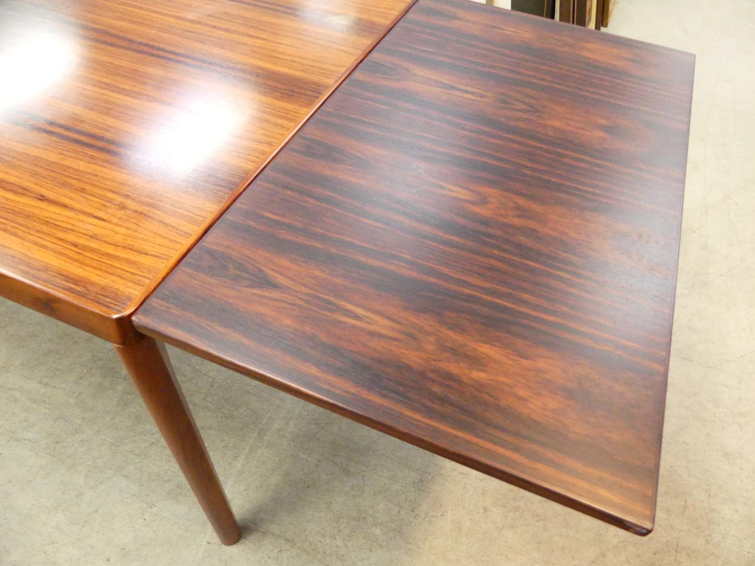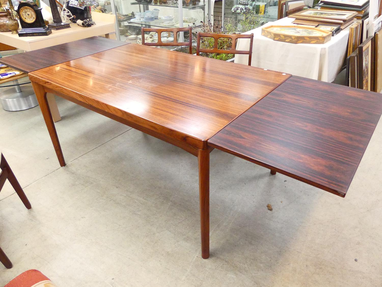 danish rosewood draw leaf dining table by henning kjaernulf for vejle stoleand with four 4 chairs, 29" x 55" x 35"