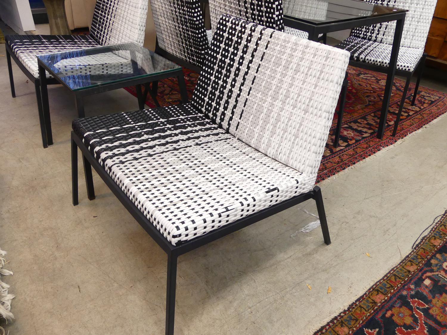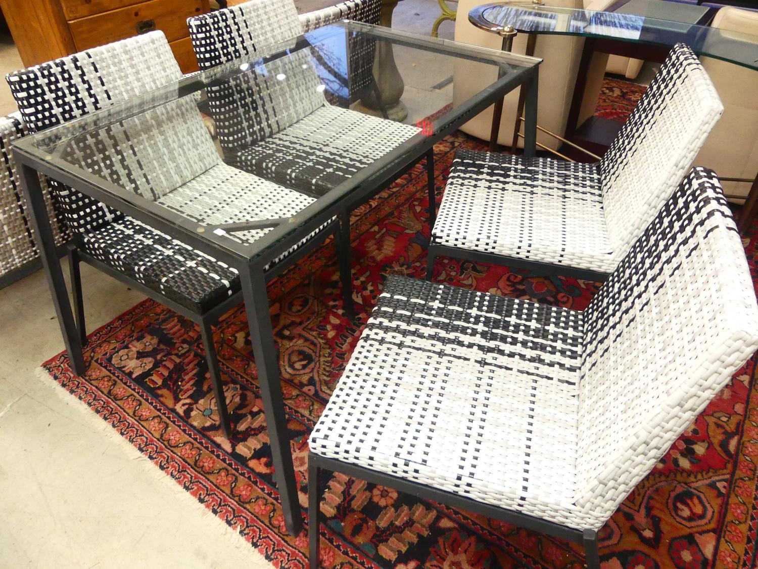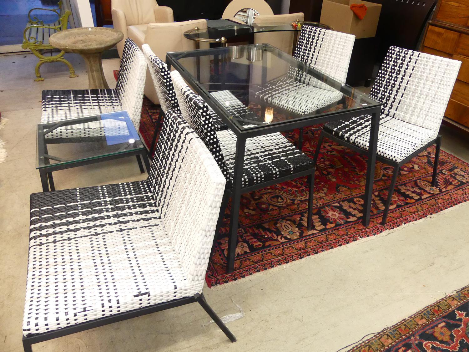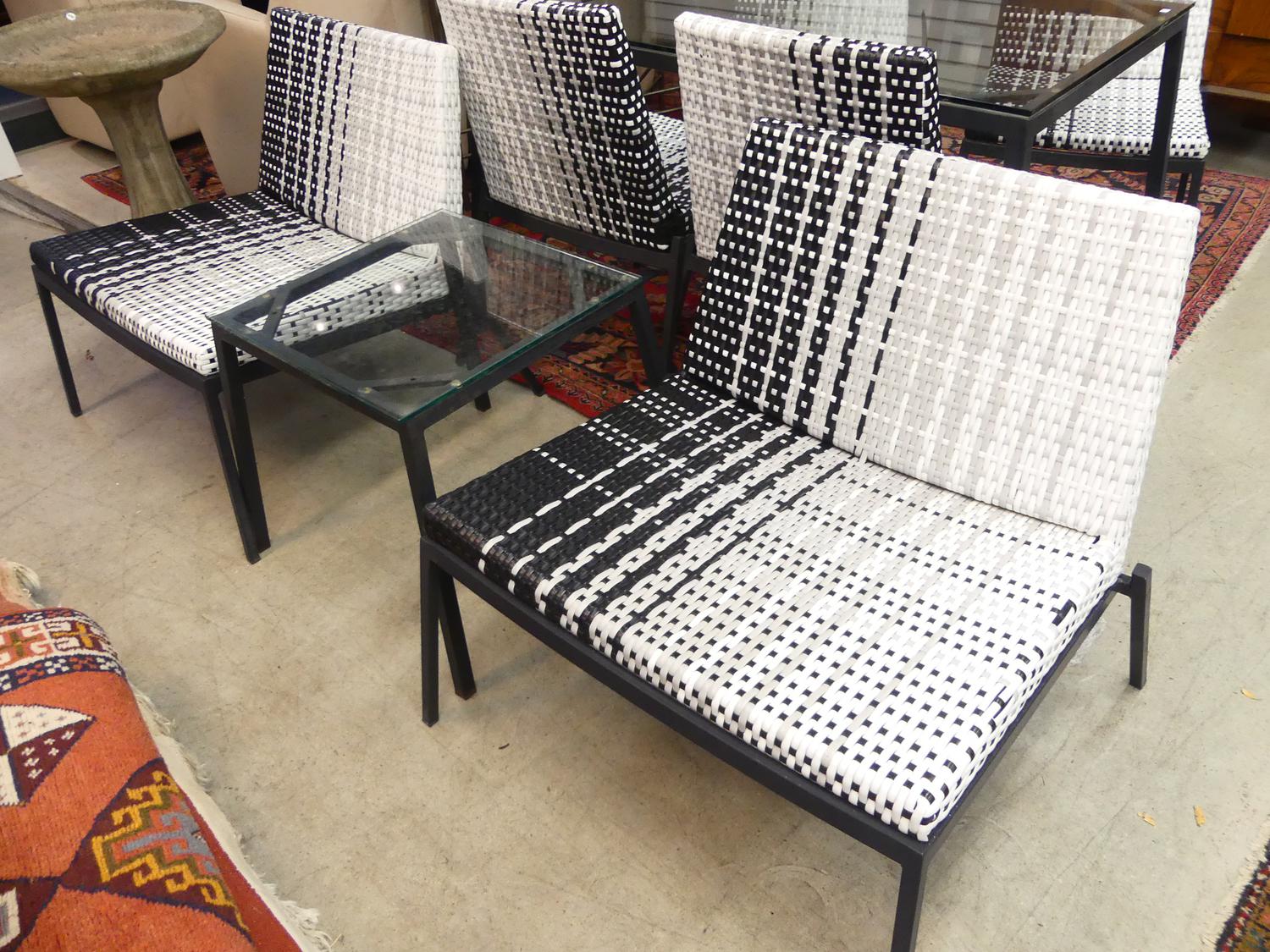 modern wrought iron patio suite, table with four chairs and two lounge chairs