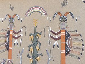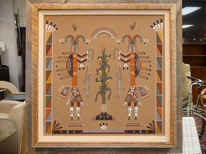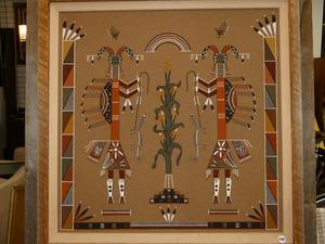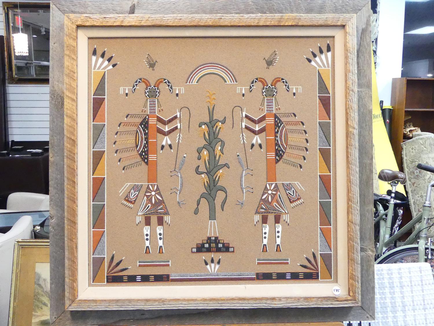 navajo sand painting by nelson lewis, 24" x 24", "hunch back yei"