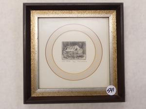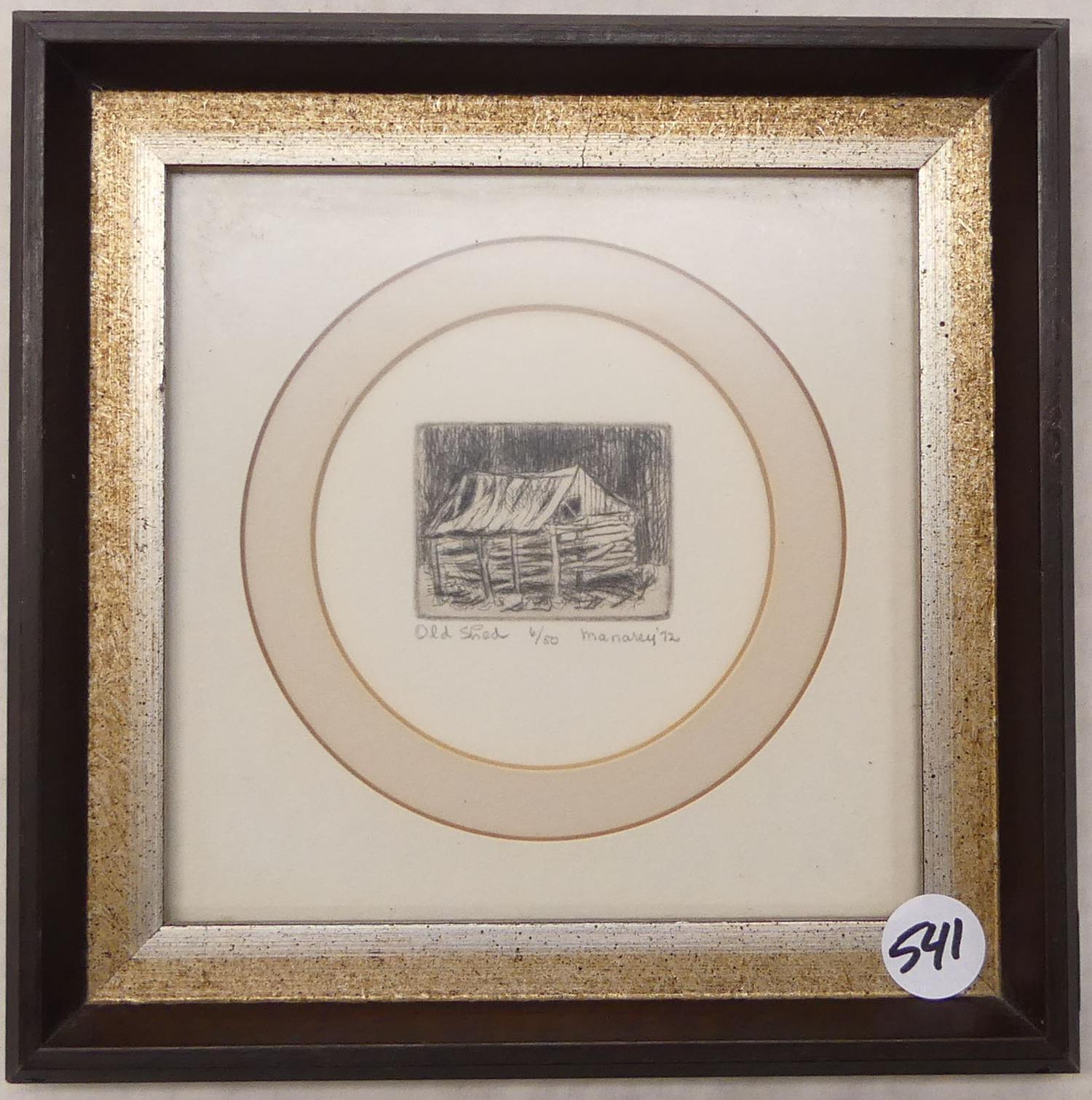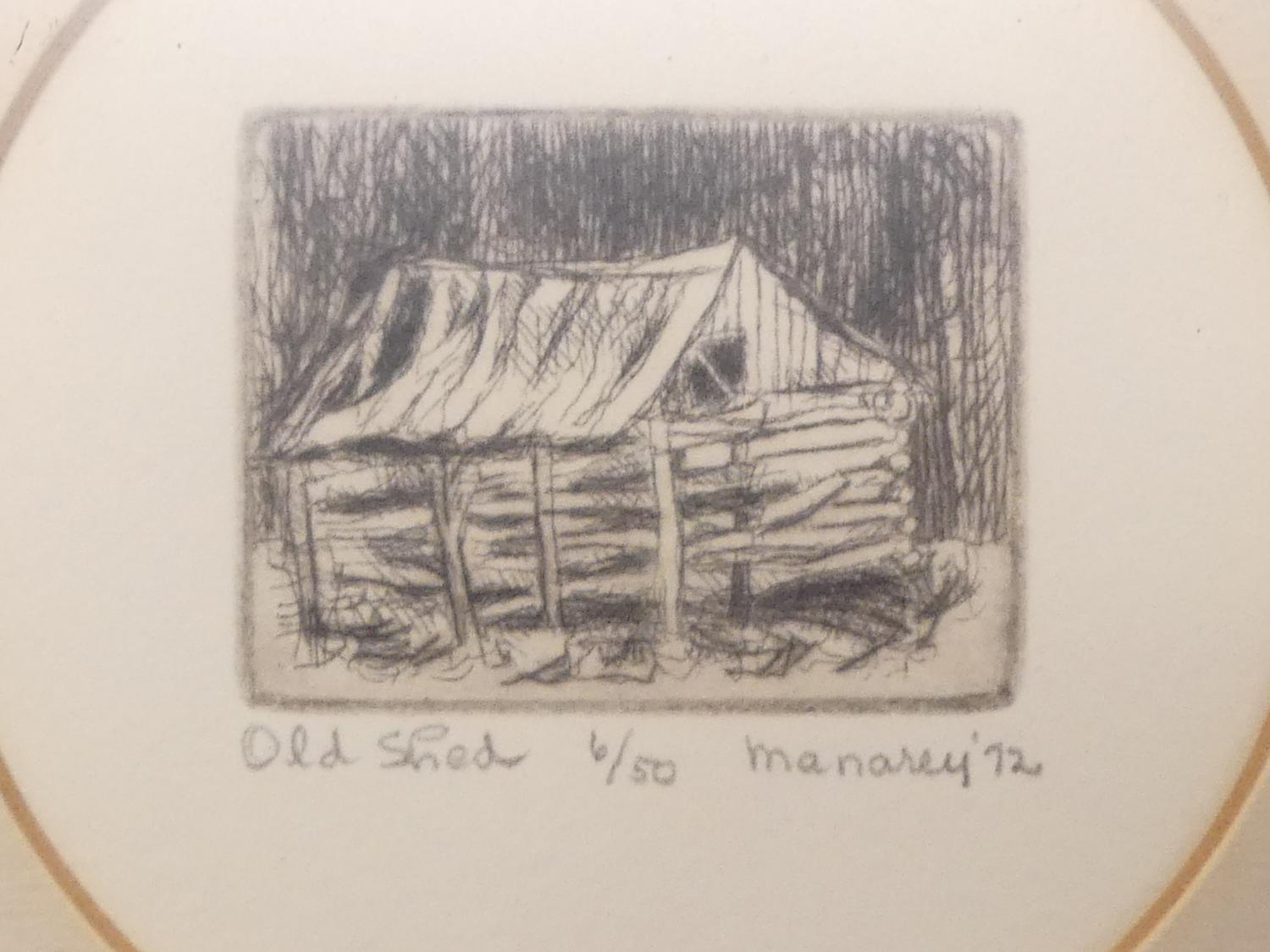 thelma alberta manarey (1913-1984), dated 1972, etching, 1 1/2" x 2", "old shed"