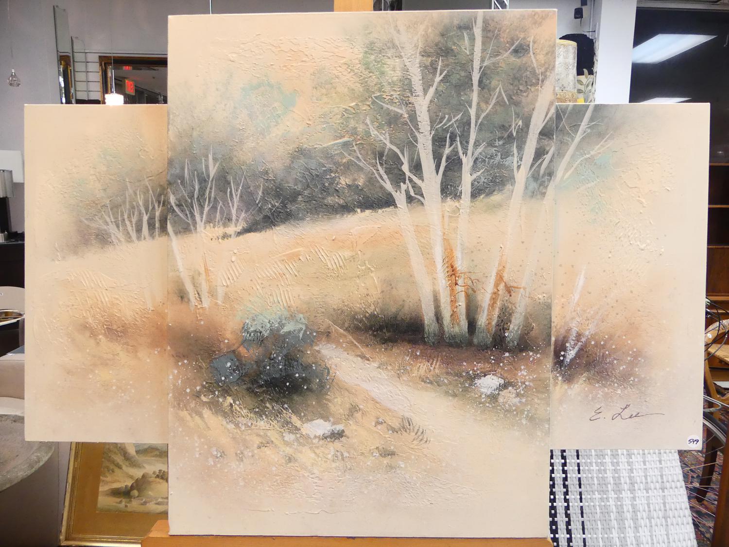 e. lee, oil on canvas diptych, 30" x 40", "winter landscape"