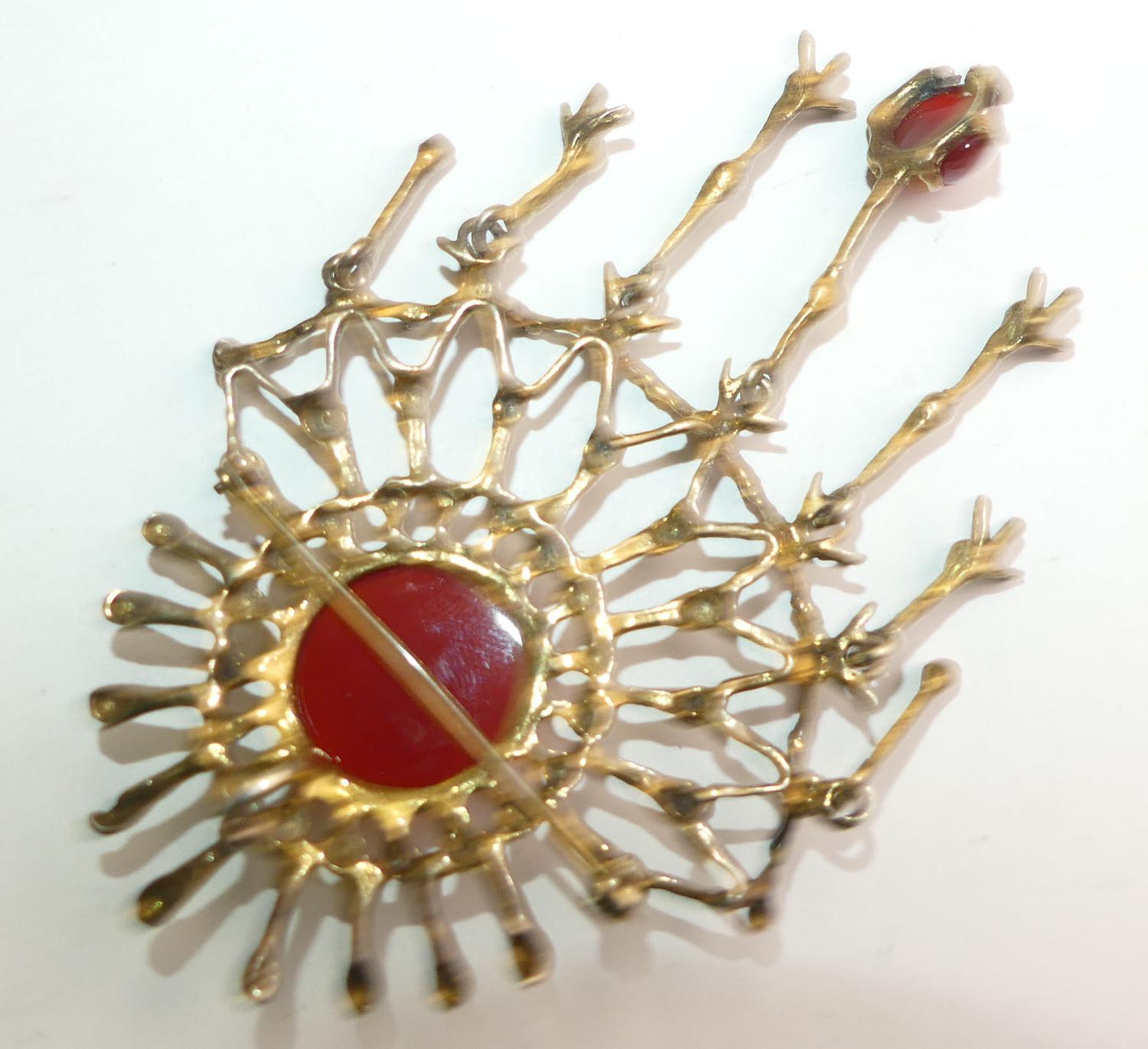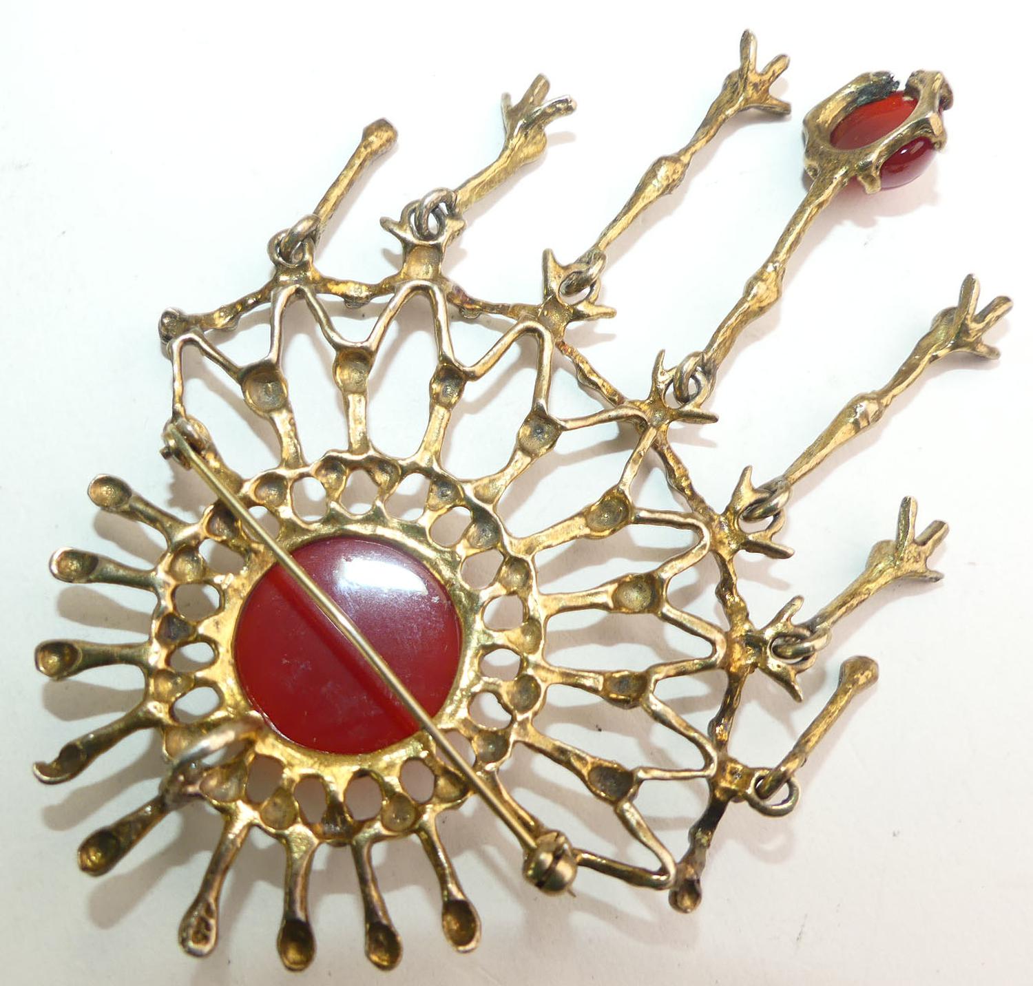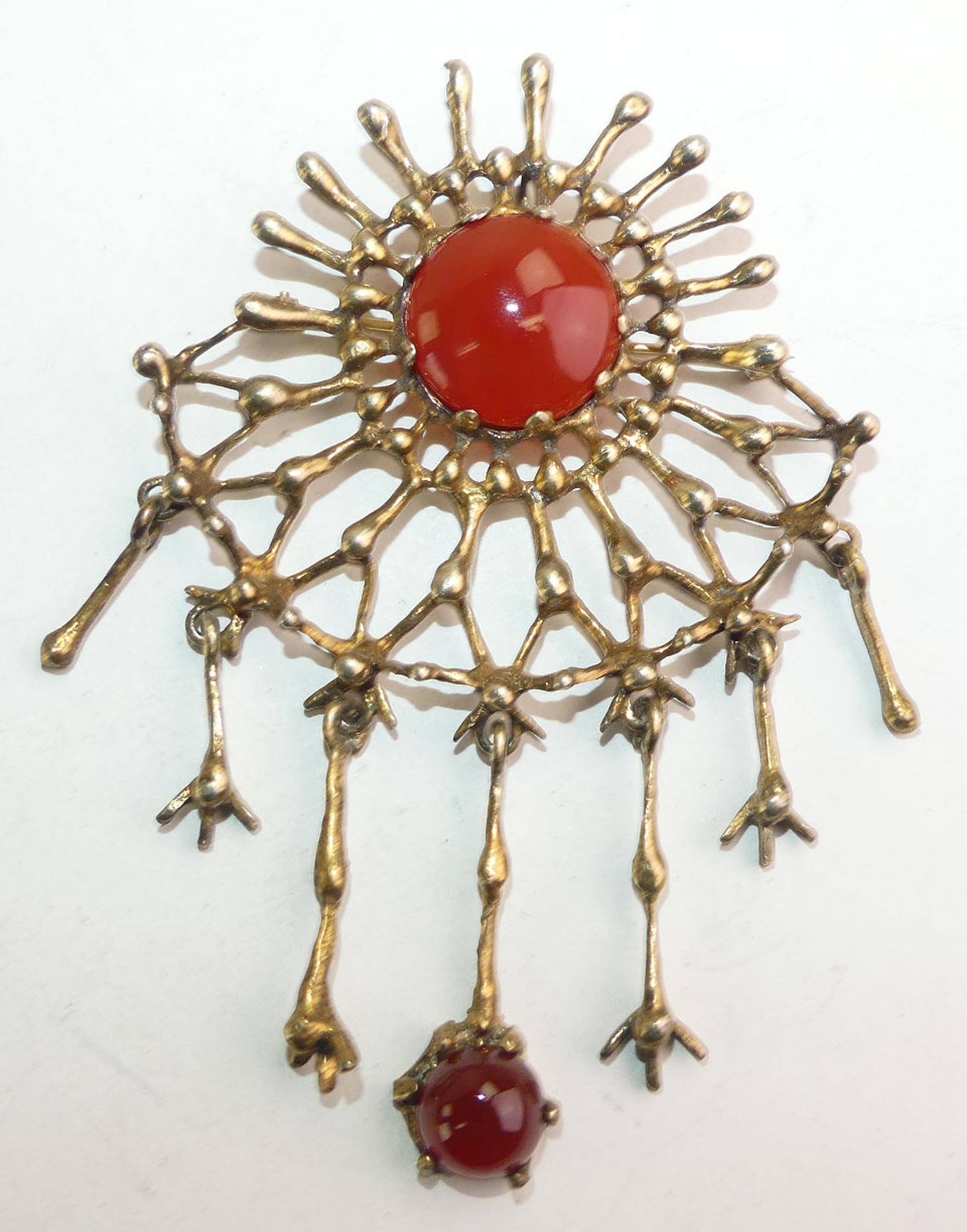 vintage brutalist sterling silver vermeil signed carnelian brooch pendant, height 3"