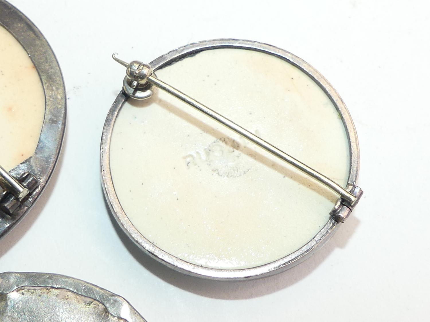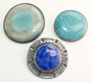 signed ruskin silver brooch with 2 handmade enamel and glass brooches