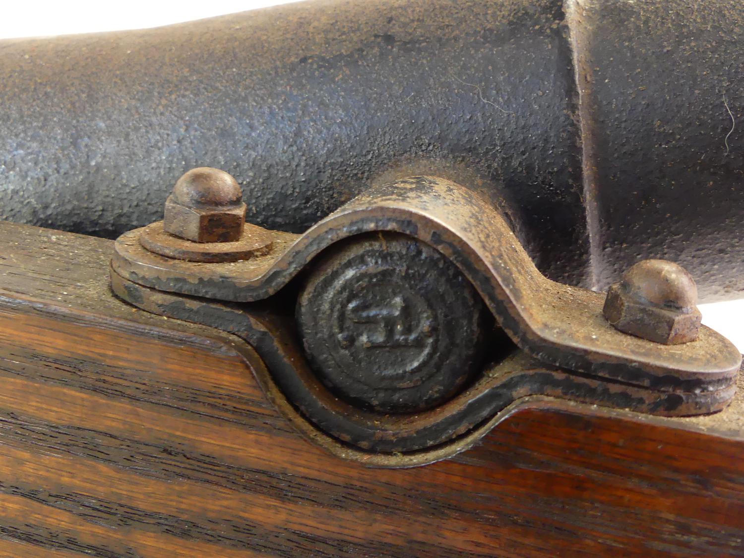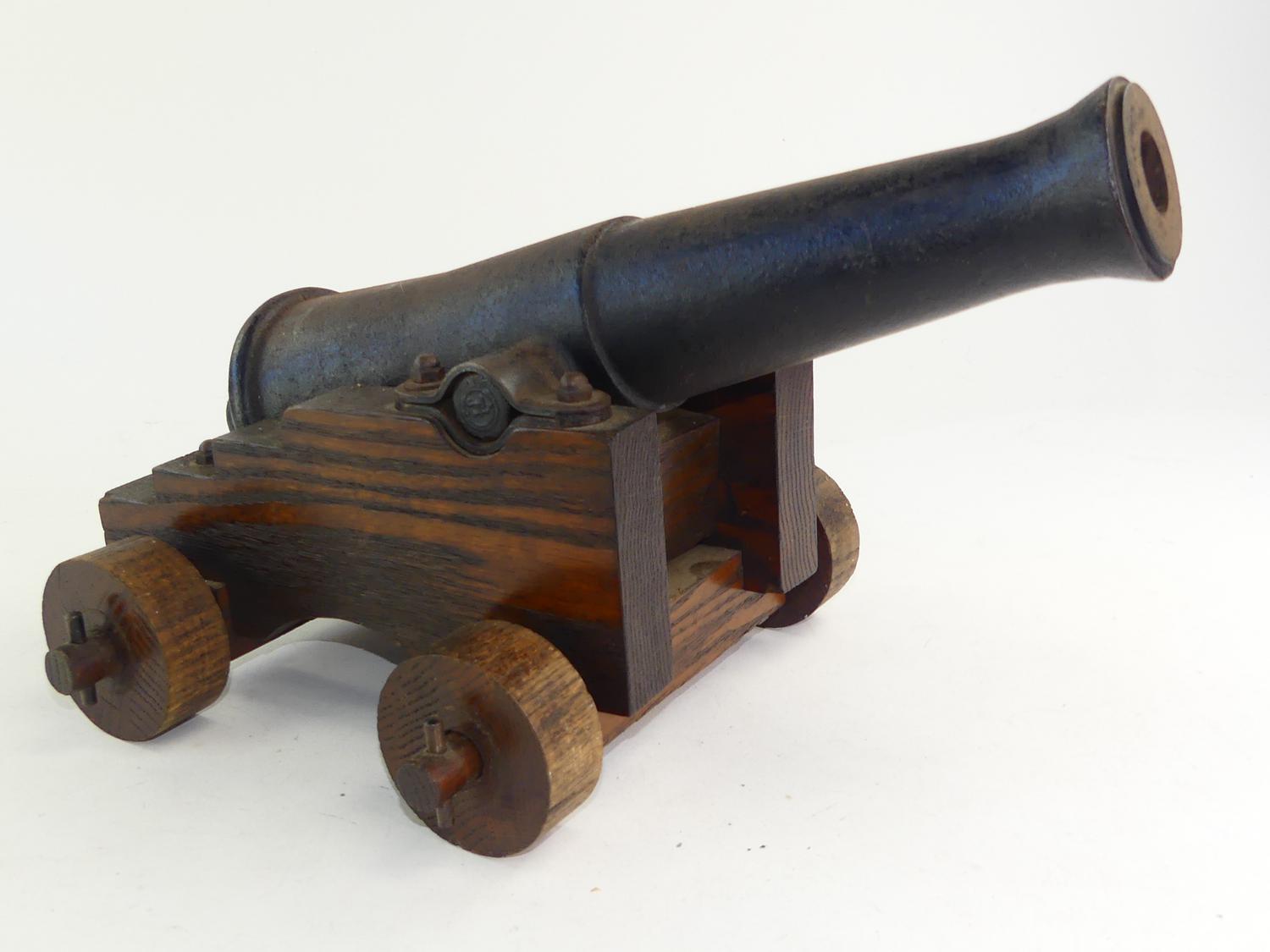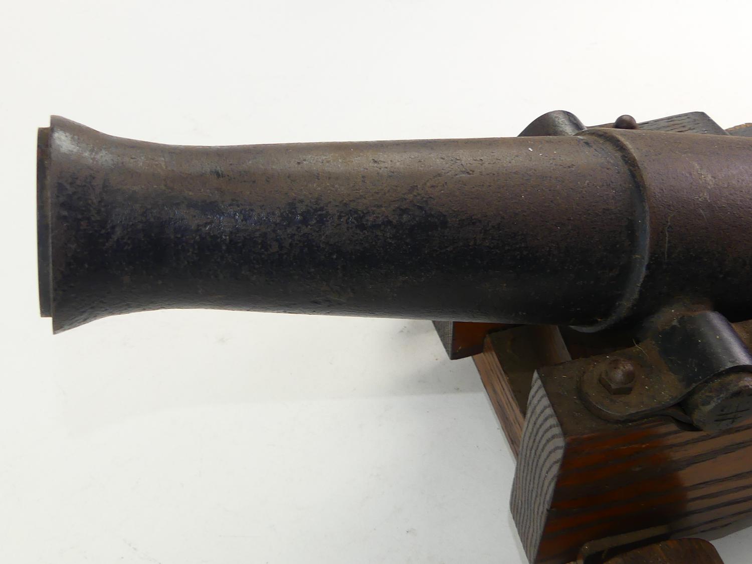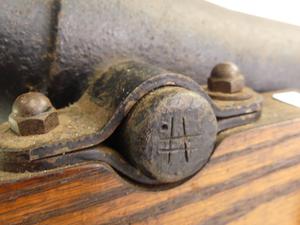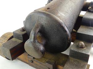 antique signal cannon on oak garrison, 10" x 16" x 12"