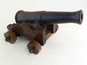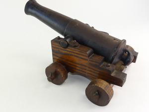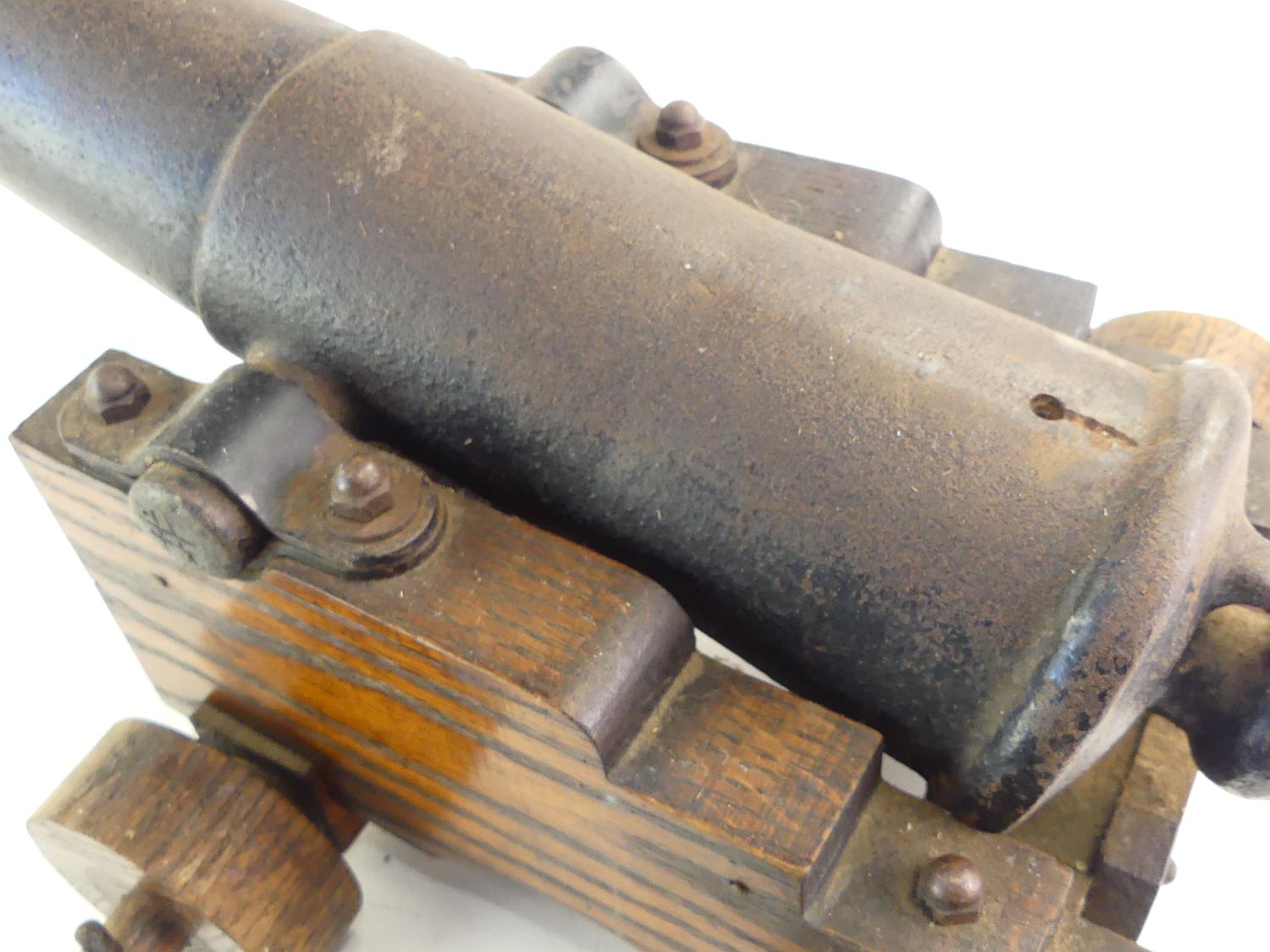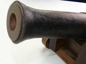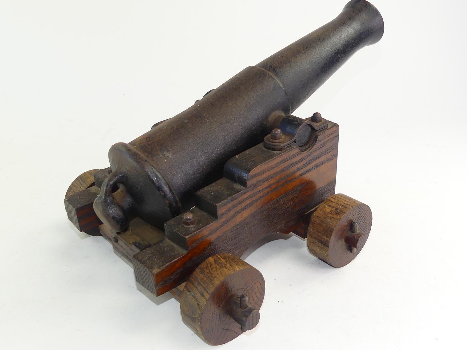 antique signal cannon on oak garrison, 10" x 16" x 12"