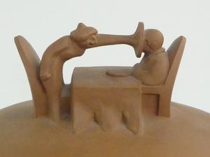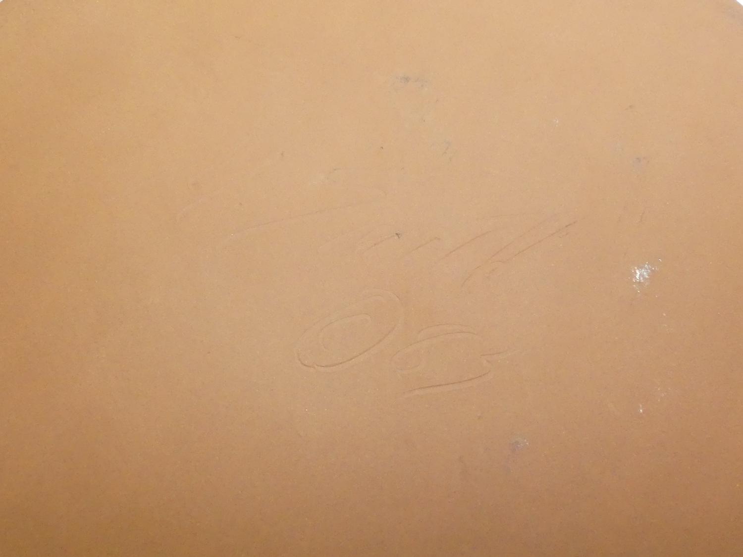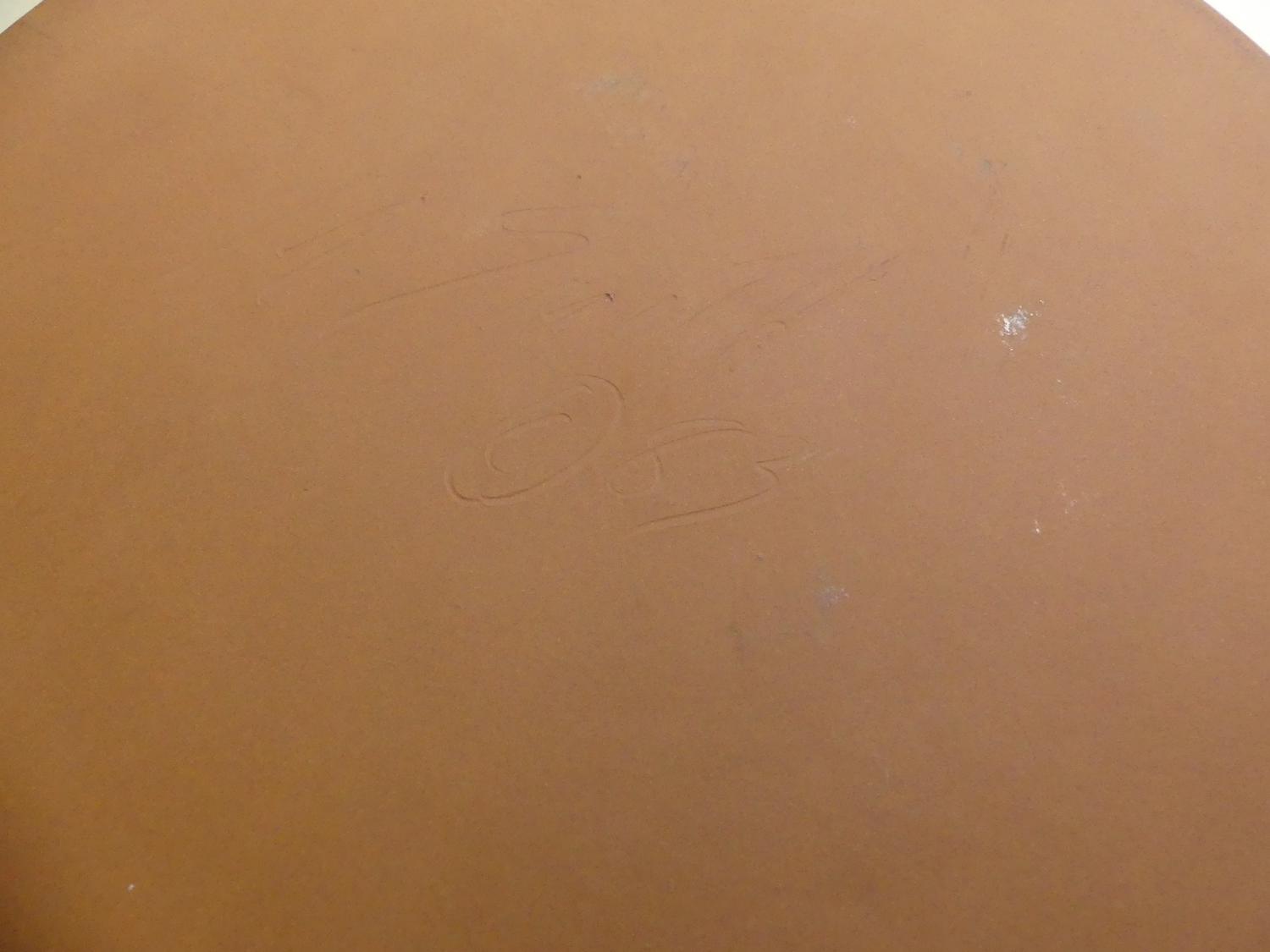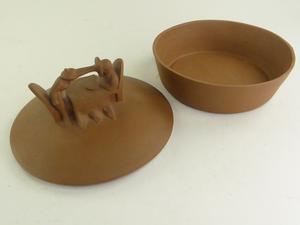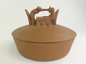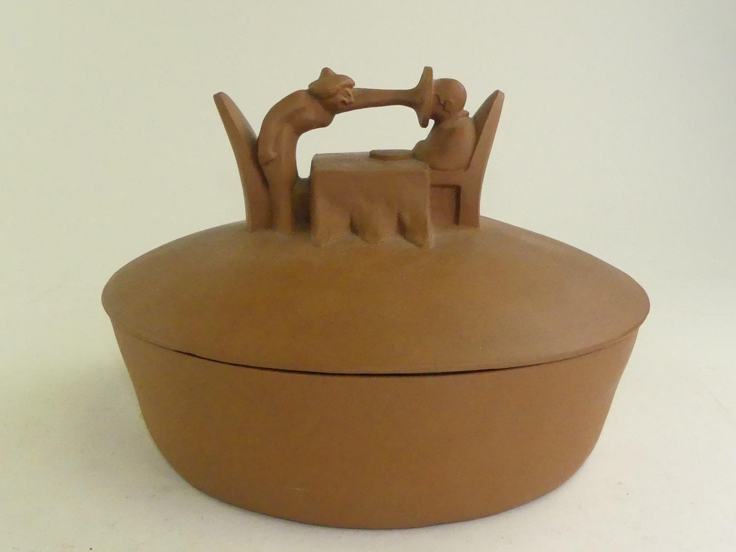 studio art pottery covered dish signed m. smith, dated 2003, 8" x 12" "dinner is served!"